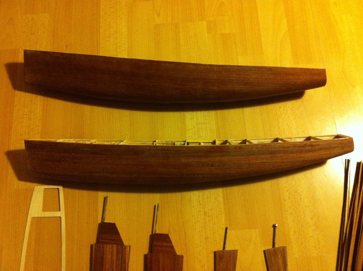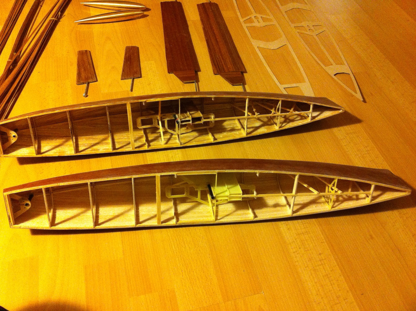 Ich habe die Rümpfe doppelt beplankt 2mm Balsa und dann Mahagoni bzw Teak Sichtbeplankung 0,7mm