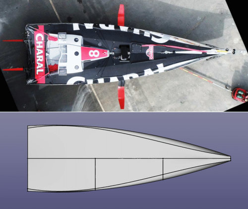Diese seltsamen Wülste beidseitig erinnern an die modernen Motor-Schlauchboote und sind die Cockpits der Crew. Das Unterwasserschiff ist wohl auf minimale Benetzung bei Verdrängerfahrt konzipiert.