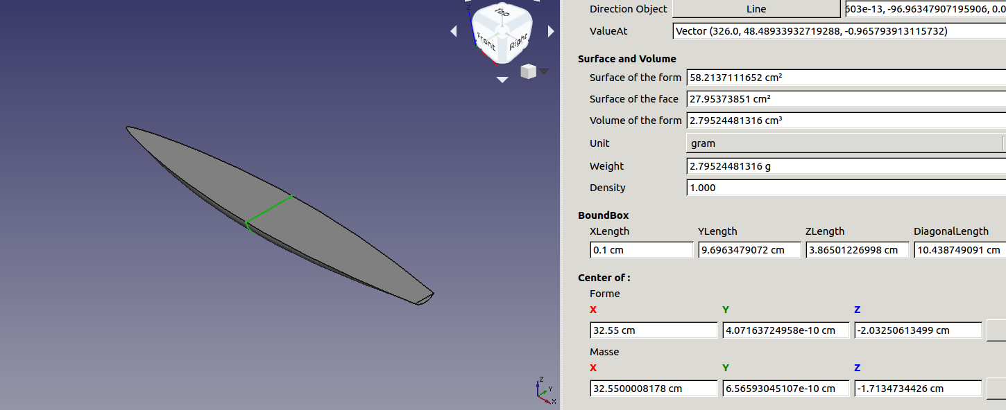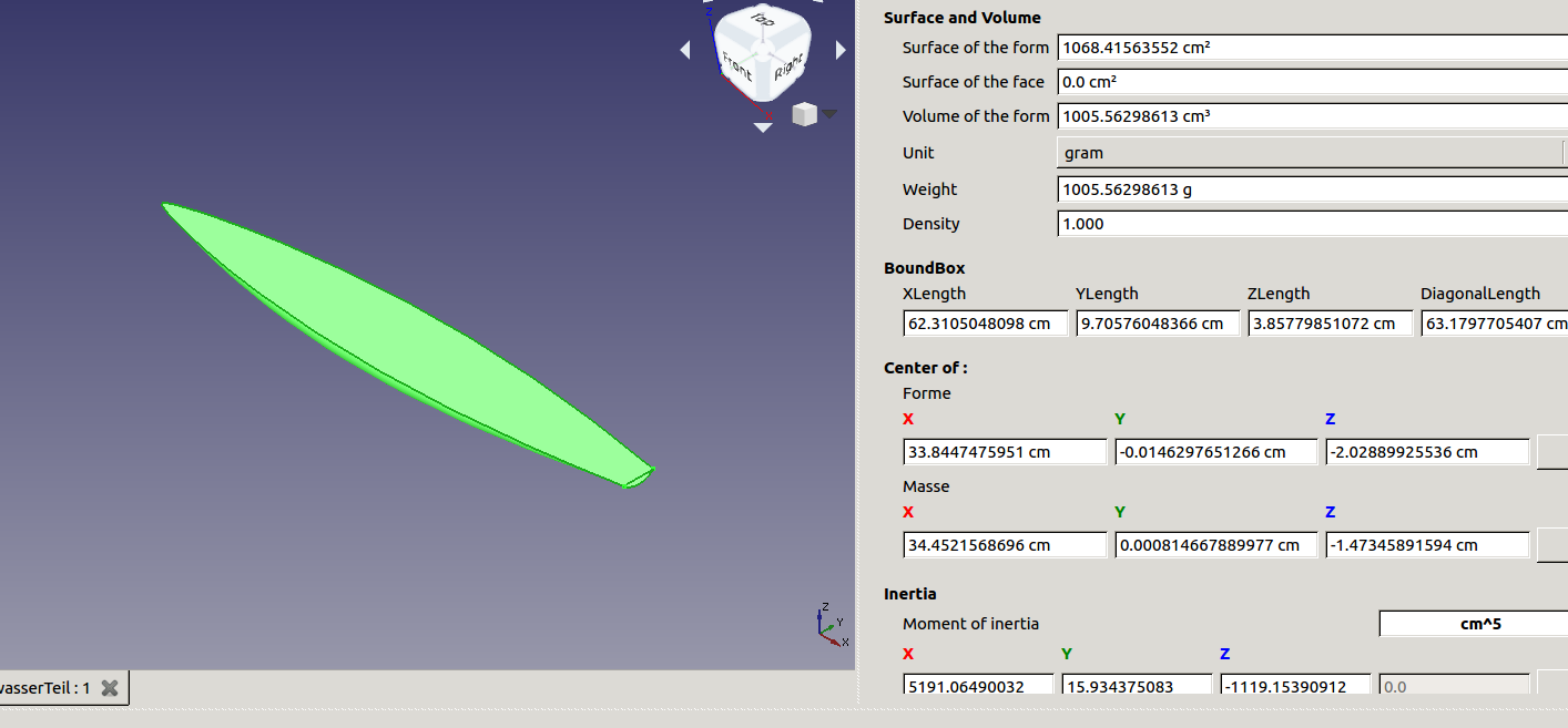 Dazu braucht Ihr das Unterwasserteil und den Spant an der breitesten Stelle. Nebst Volumen des Unterwasserteiles die Max_Querschnittfläche des Spantes (nur Querschnittsfläche anklicken!!).