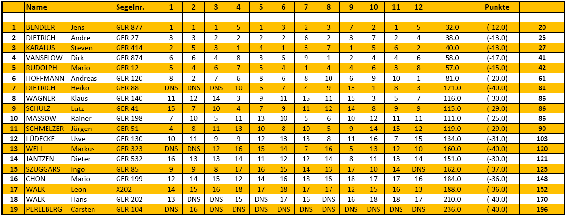 DNFs und DNSs sind als DNS subsummiert, habe meine Kladde nicht zur Hand und in Regatta lässt sich das nicht rückwirkend erkennen. Ist für die Wertung aber eh egal, gibt alles Teilnehmer+1 Punkte.