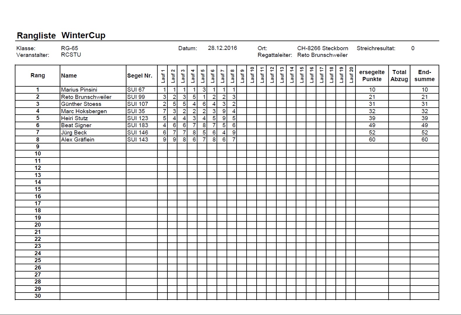 Der Winter Cup des RCSTU war eine neue Regattaserie und ist zum vollen Erfolg geworden. Ziel war es die Segler der RG65 Klasse im Winter nicht einschlafen zu lassen und uns auch bei eisigen Verhältnisses zu messen. Der sehr positive Feedback aller Teilnehmer ist Grund genug den Winter Cup auch in der nächsten kalten Jahreszeit fortzuführen. Und hoffentlich dann mit noch mehr begeisterten Seglern vom In- und Ausland.