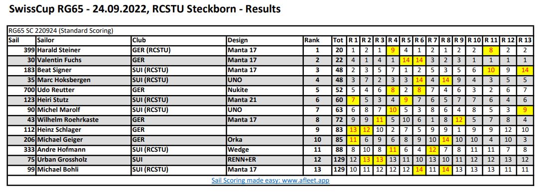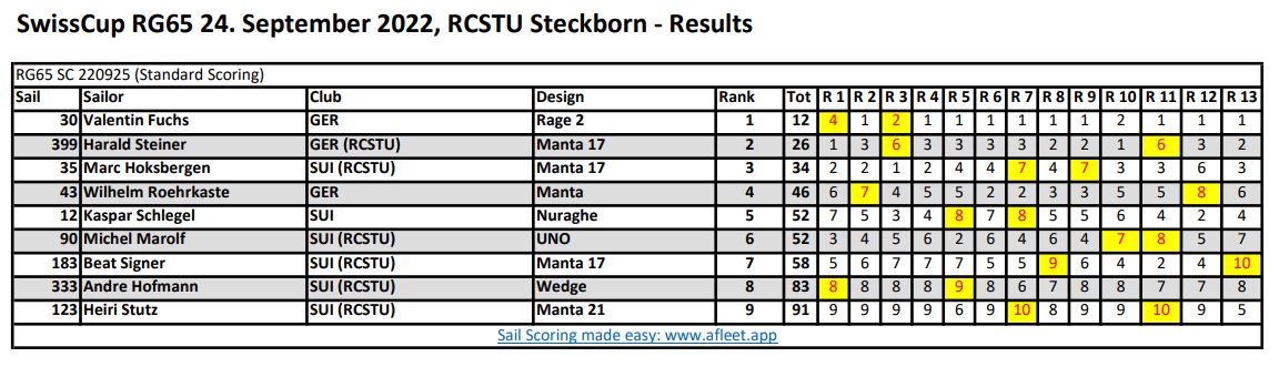 Am Samstag waren wir 13 Segler, am Sonntag 9. Und an beiden Tagen konnten wir trotz teilweise widrigen Windverhältnissen jeweils 13 Läufe segeln. Lang, kurz, spannend, herausfordernd, eng oder klar. Es war alles dabei und natürlich auch Sieger und Verlierer. Und wieder einmal eine gut gelaunte Gruppe von RG65 Enthusiasten mit viel Wille und grossem Können. Es hat Spass gemacht !!