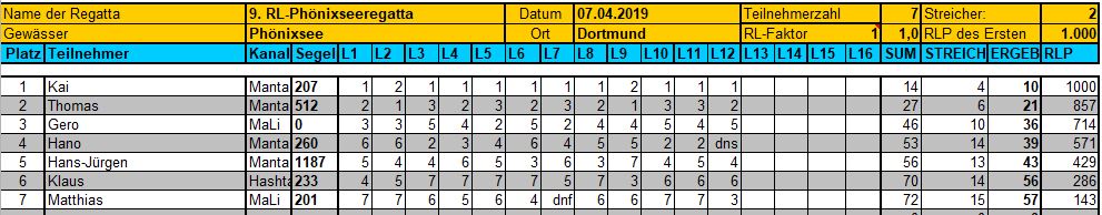 Anfangs sah es noch nach einer gemächlichen Regatta aus, aber spätestens nach der Mittagspause mussten alle auf B- Rigg wechseln. Bedingt durch die teilweise stürmischen Böen hatten viele zum Schluss mit Steckern, sogar einmal einem Riggverlust sowie Hano mit einem abgerauchten Segelservo zu kämpfen, trotzdem nur ein DNF und ein DNS.