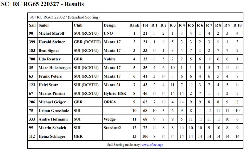 Die Regatta gewinnen konnte mit Michel Marolf ein "Neuling" in der Schweizer Szene. Gute Vorbereitung im Winter beim RCSTU WinterCup, mit der UNO ein wirklich wettbewerbsfähiges Boot und seine nachhaltige Konsequenz beim Segeln waren die Essenzen, die ihm den Sieg brachten .. BRAVO Michel!