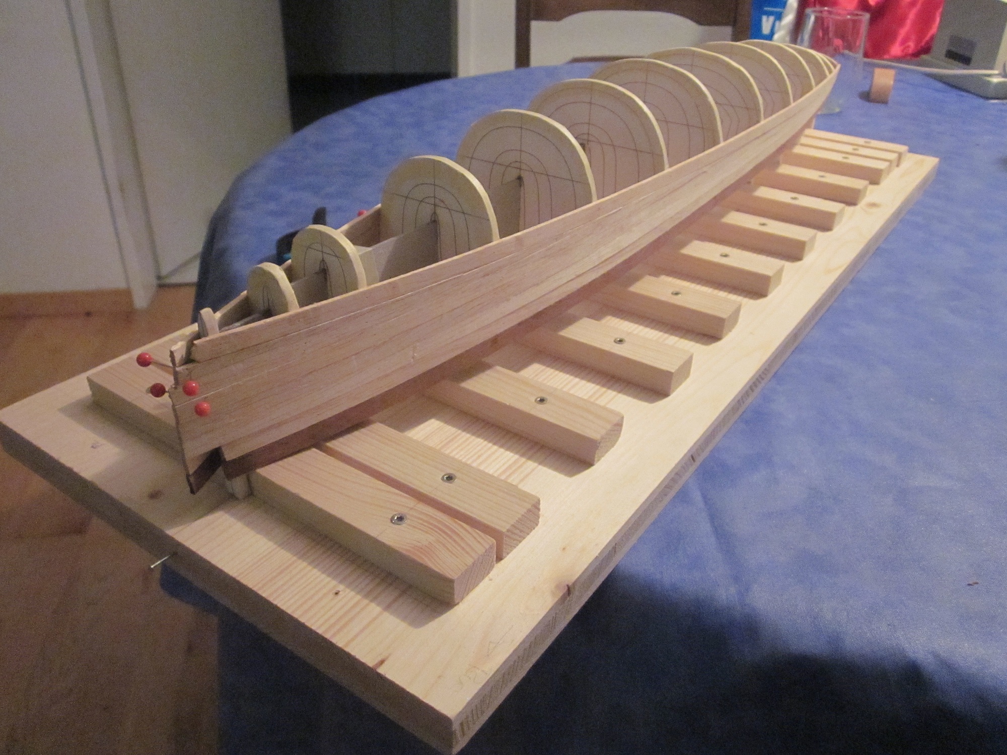 Hier wird an einer Goth gebaut. Ich baue das Boot in Balsa 2mm, am Deckrand, Steuerbord , Backbord und bootsmittig auf der Unterseite verbaue ich je eine Mahagonileiste.