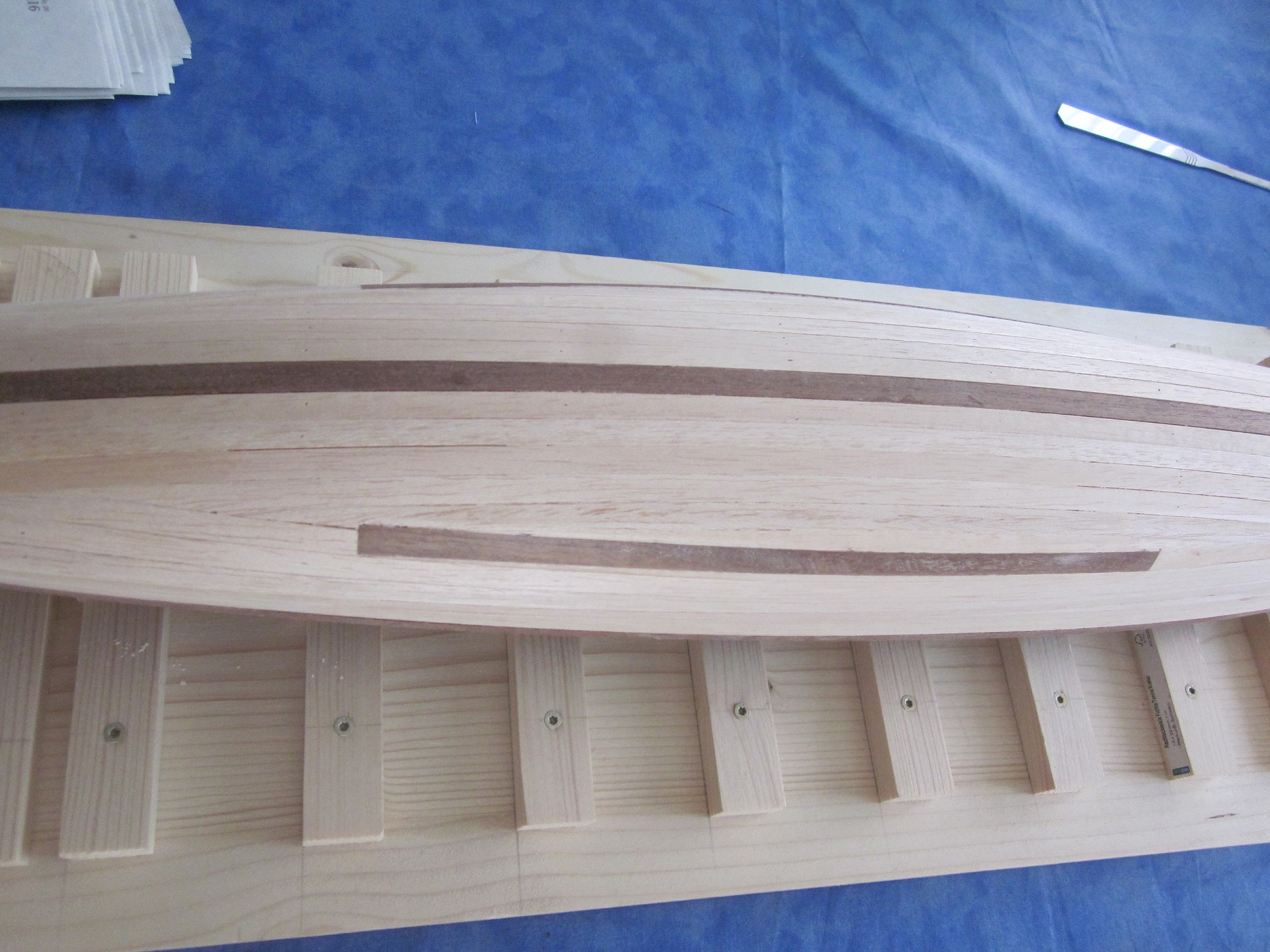 gut zu sehen die Abdeckbandresten, die das Verkleben der Spanten mit den Planken verhindern und so das Herausnehmen der Planken sehr erleichtern.