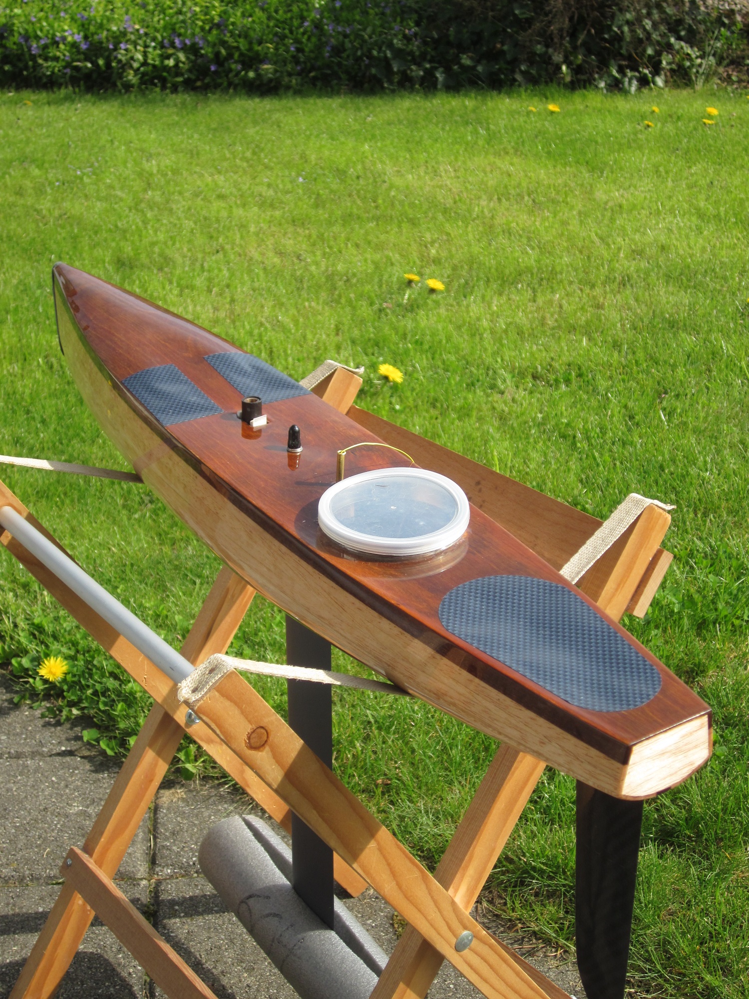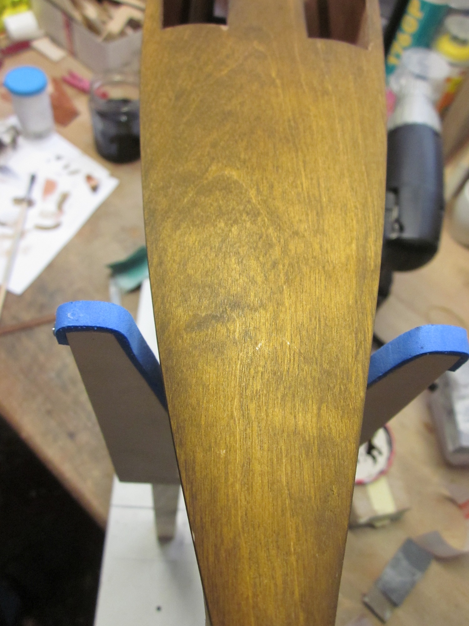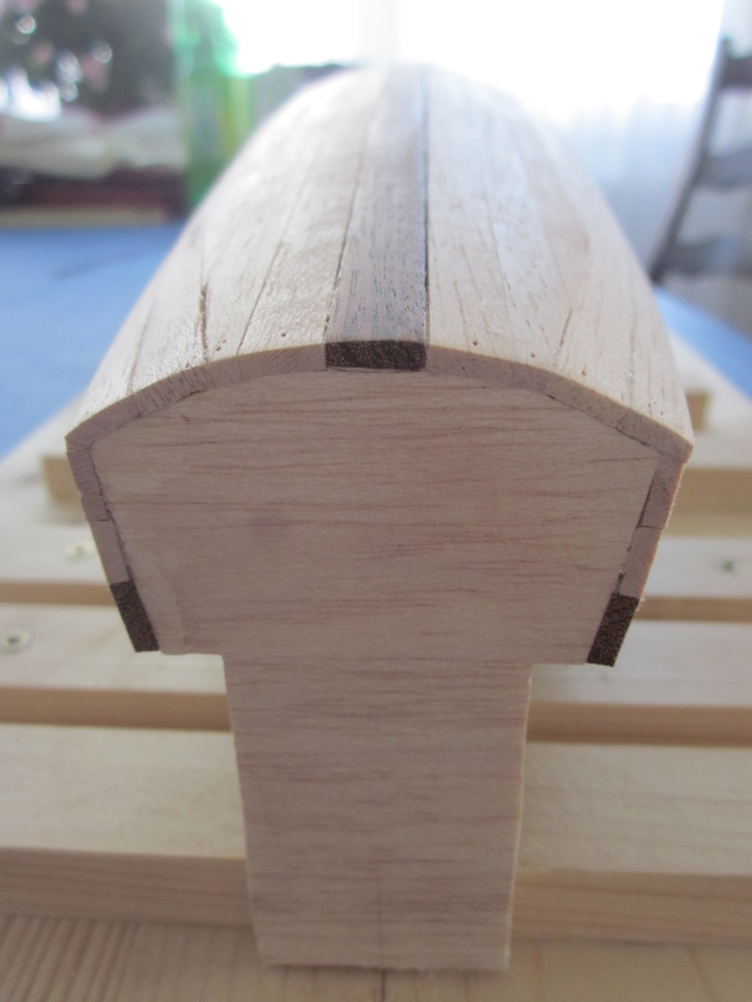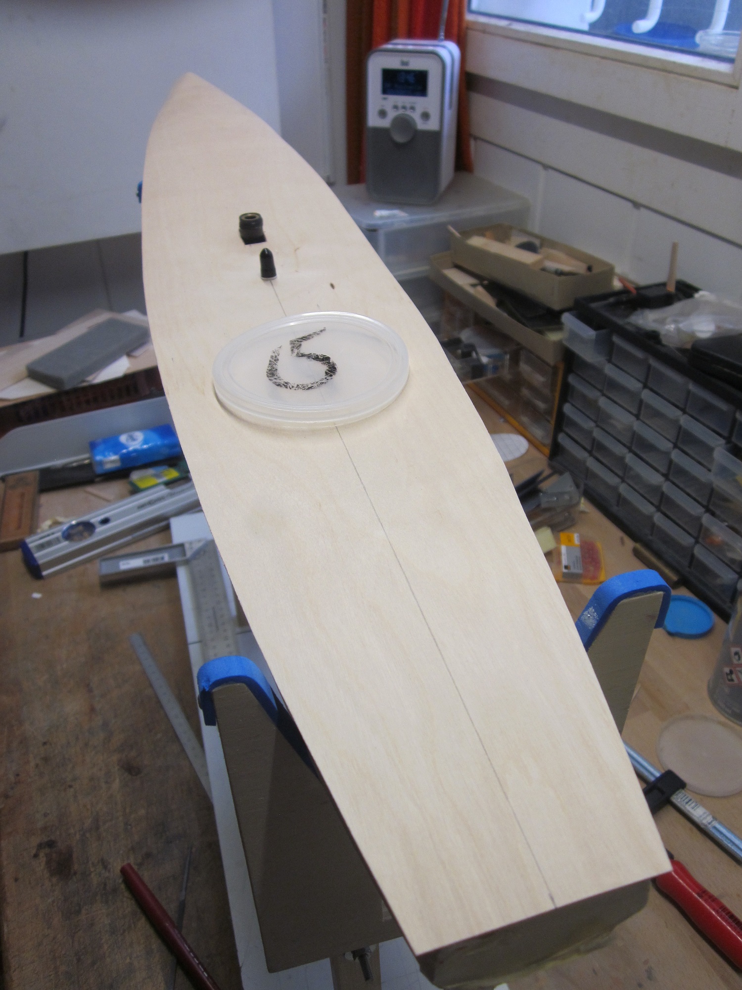 Als nächster Schritt musste die Deckblatte auf die Schale montiert werden, dazu habe ich das Holz ganz an der Bugspitze gut gewässert, damit ich die Rundung machen konnte, ohne dass die Holzplatte riss.