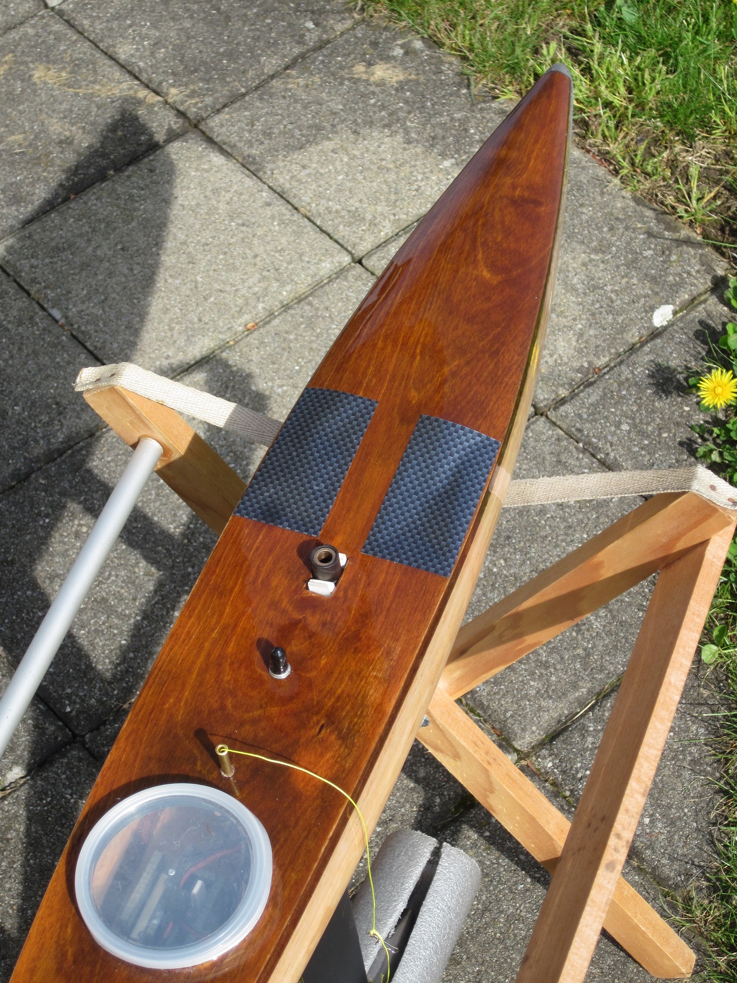 Die nächsten Schritte waren der Einbau der Servo-Halterungen und der Halterung für den Empfänger und den Bec. Die Halterungen habe ich aus selbst laminiertem Sandwichmaterial hergestellt und sie sind sehr einfach gehalten. Der Segelverstell-Servo wurde liegend eingebaut und der Servo wird einfach mit einem Sperrholzplättchen eingeklemmt. Empfänger und Bec werden zwischen die Seitenwände geklemmt und an der Stirnwand Seite Bug habe ich 2 Löcher gebohrt für die Antennen.