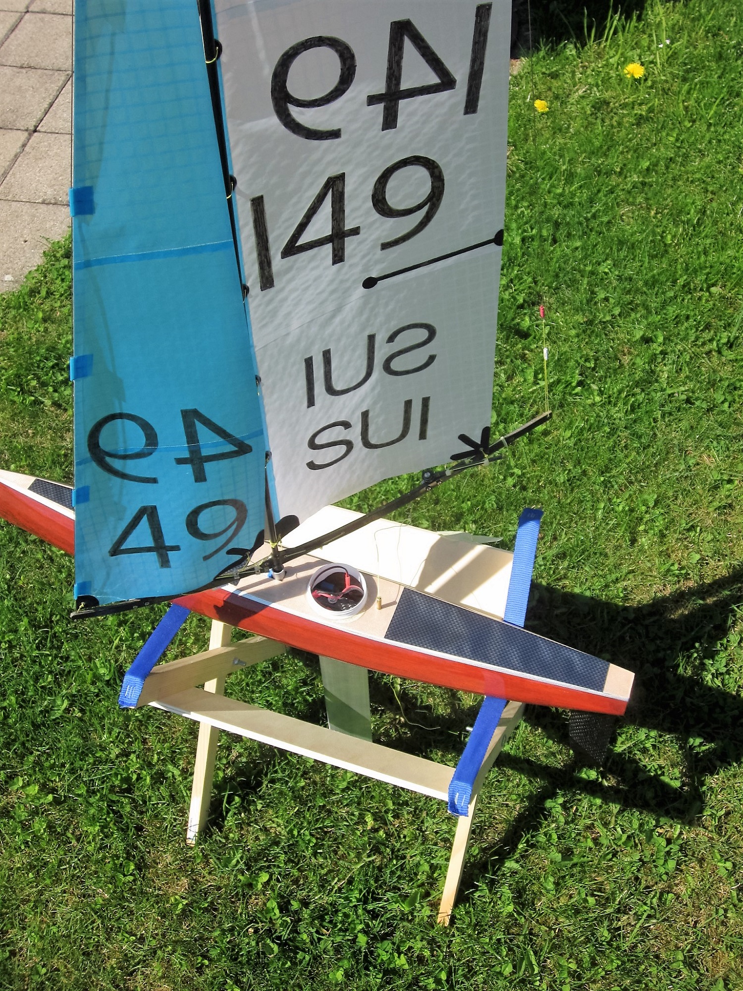 Das Boot ist nun mit Klarlack gespritzt, ist sehr schön geworden. Nun geht es noch an den Einbau der Elektronik und das Anbringen der Patches und dann kann das Boot seinem Element, dem Wasser übergeben werden. Die Jungfernfahrt ist gut verlaufen, das Boot liegt sehr schön im Wasser und springt auch bei schwachem Wind gut an.