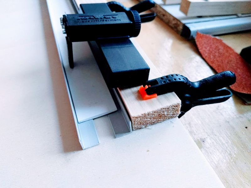 Das Material: 1 Grundplatte, 1 Unterfütterungsleiste, 2 Alu-Profile und ein Kunststoff-Flachprofil