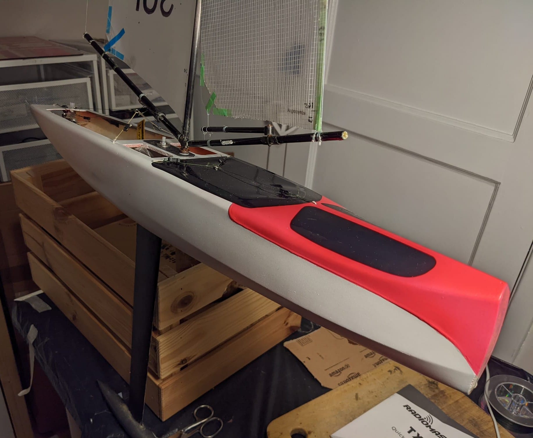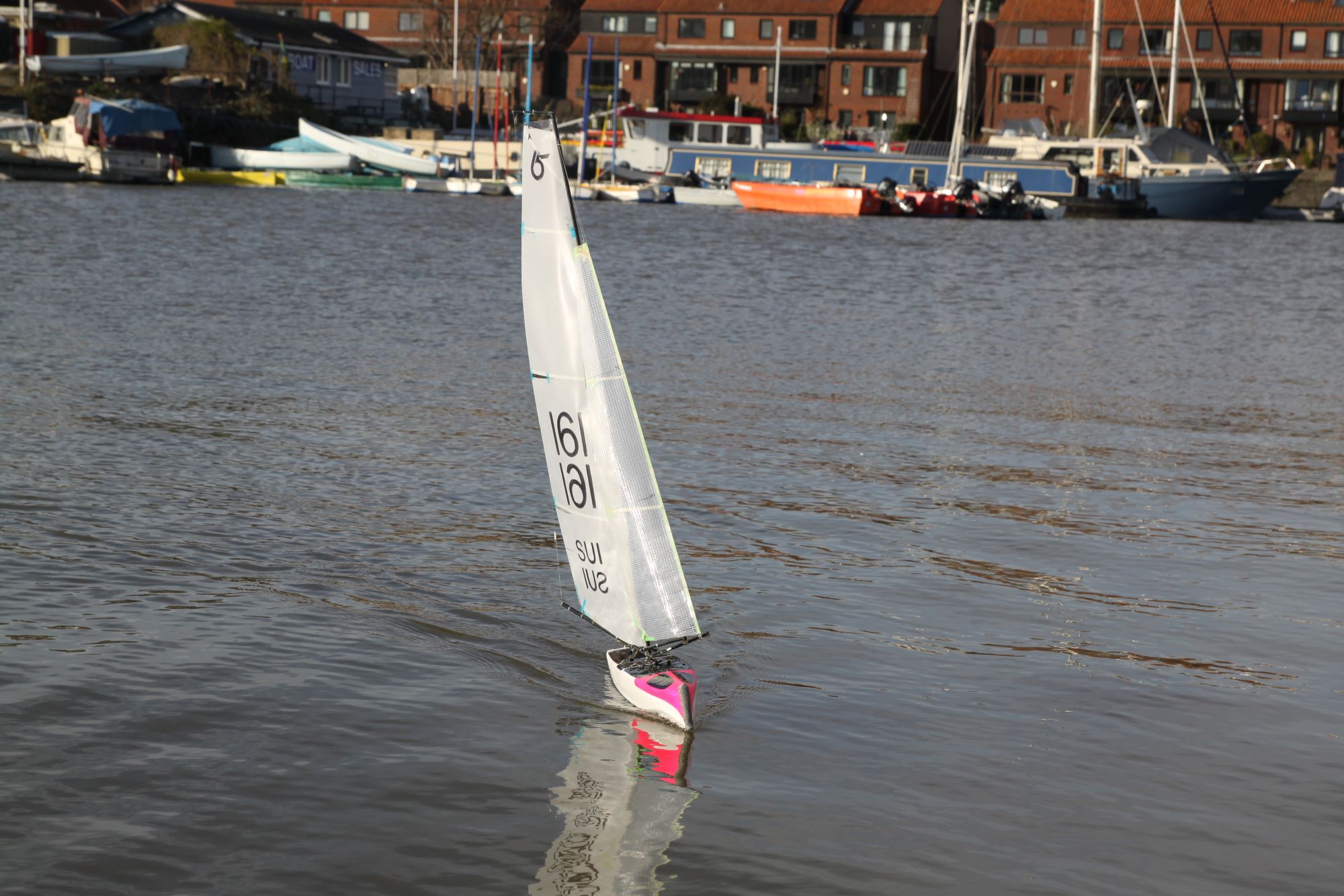 Nun ja, das Boot ist neu und das beste set-up ist offensichtlich noch nicht gefunden. Von meinen Erfahrungen soweit kann ich nur sagen, dass das Boot Vorwind sehr viel Wind verträgt. Das war eines meiner Hauptanliegen mit dem neuen Design. Im Vergleich zur Nuraghe, ist das Boot einfacher zu segeln, also ausgeglichener über einen größeren Windbereich. Aber vielleicht hat der Rumpf mehr Widerstand als einige Kontrahenten, vielleicht habe ich die Breite oder das Volumen im Bug ein wenig zu sehr gepuscht im Design. Das geht mir natürlich Alles durch den Kopf.