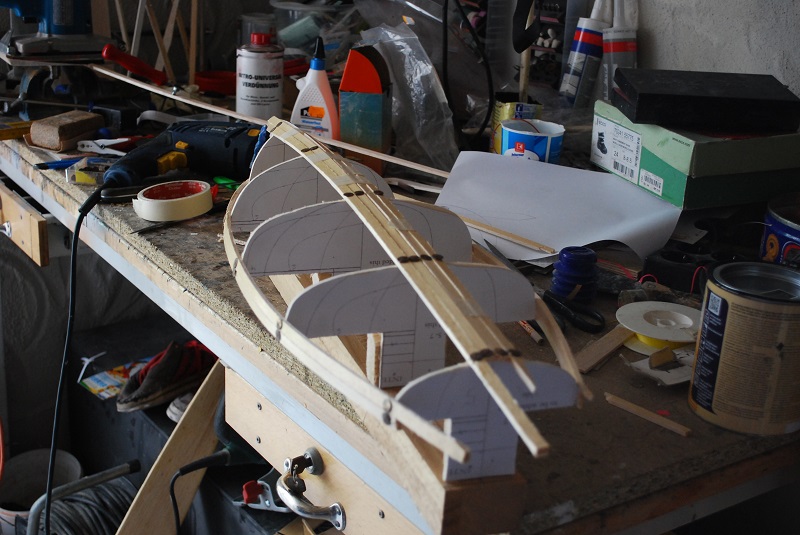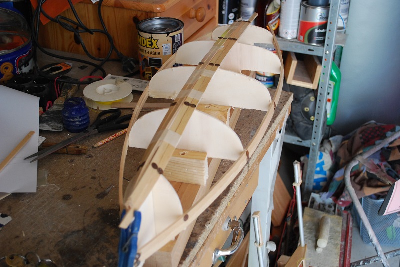 Die ersten Planken 4mm Balsa sind schon mal auf den Pappel Spanten drauf.