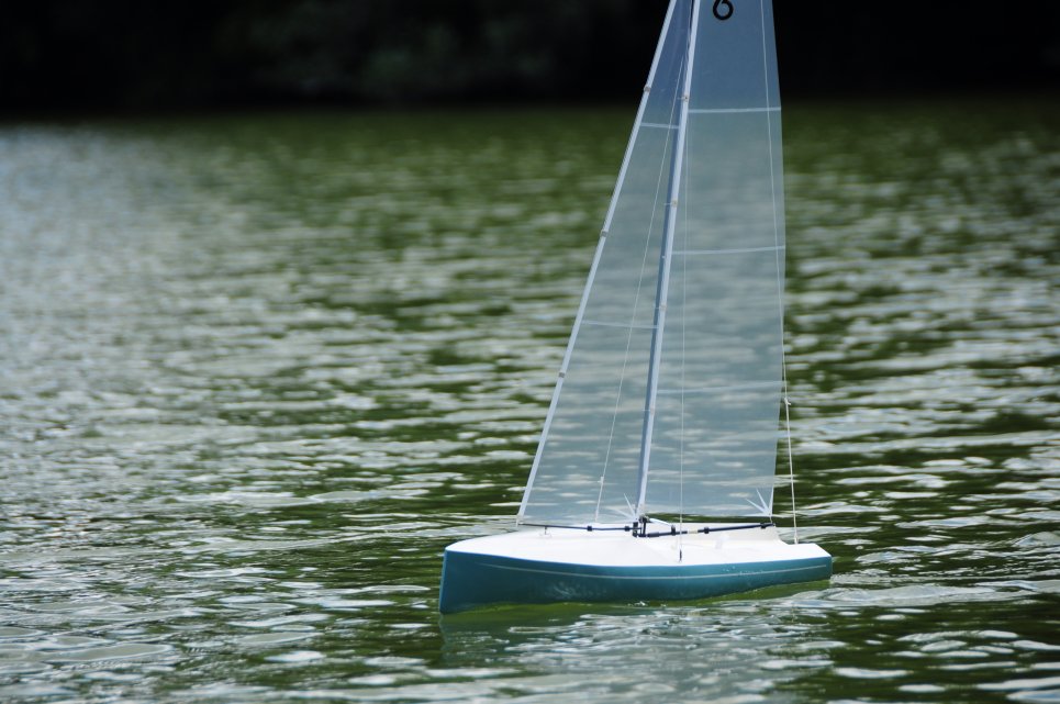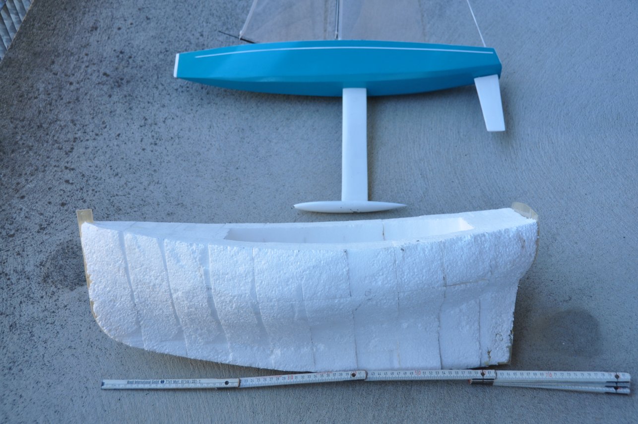 Mit meiner Tiboulen habe ich sehr gute Erfahrungen gemacht und versuche eben, das Ding nochmals zu otimieren, d.h. schmaler, weniger Tiefgang und weniger Breite, Swingrigg. Die Tiboulen hatte ich nach einem Originalriss gebaut. Nur Rigg, Kiel, Ruder und entfernt das Deck "verRG65ert". Bei einer Breite von 22,5cm habe ich ein Schwert von 21cm Länge und einem Kielgewicht von ca. 250g montiert. Sicher nicht ein absolutes Spitzenboot, jedoch muss ich mich auch nicht allzu heftig fürchten... Die Rumpfstabilität macht vieles wieder wett.