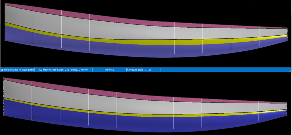 Oben die letzte Version, unten der aktuelle Arbeitsstand. In Gelb mal markiert wie die erste nicht ausgeschnittene Planke aussehen würde.
