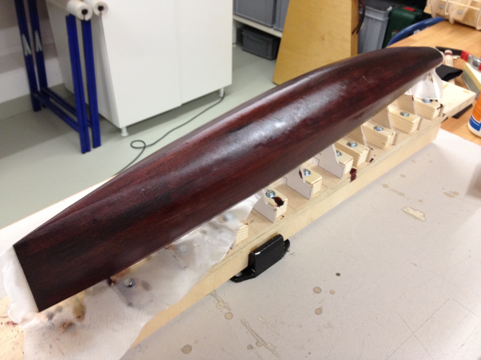 oh, da war ja ich noch angesprochen, sorry, nicht gesehen. Ich dachte daran, die auf der Grafik weisse Planke am Bugspant um 18mm weiter runter gegen die Wasserlinie laufen zu lassen und das auf Spant 445 auslaufen zu lassen oder anzupassen. Das gäbe eine nahezu perfekte Linie. Nun habe ich den Rumpf gebeizt, kommende Woche wird noch geharzt.