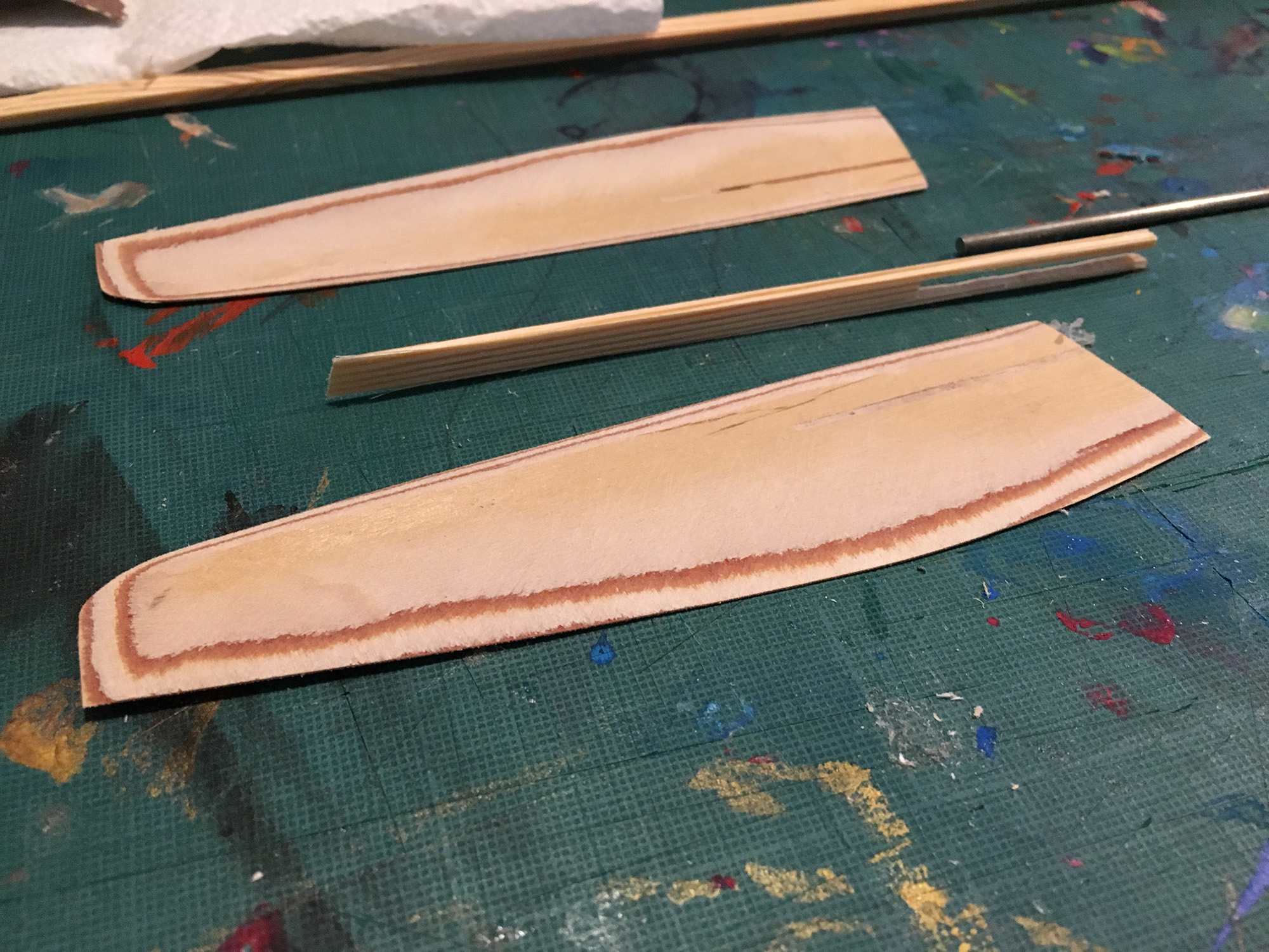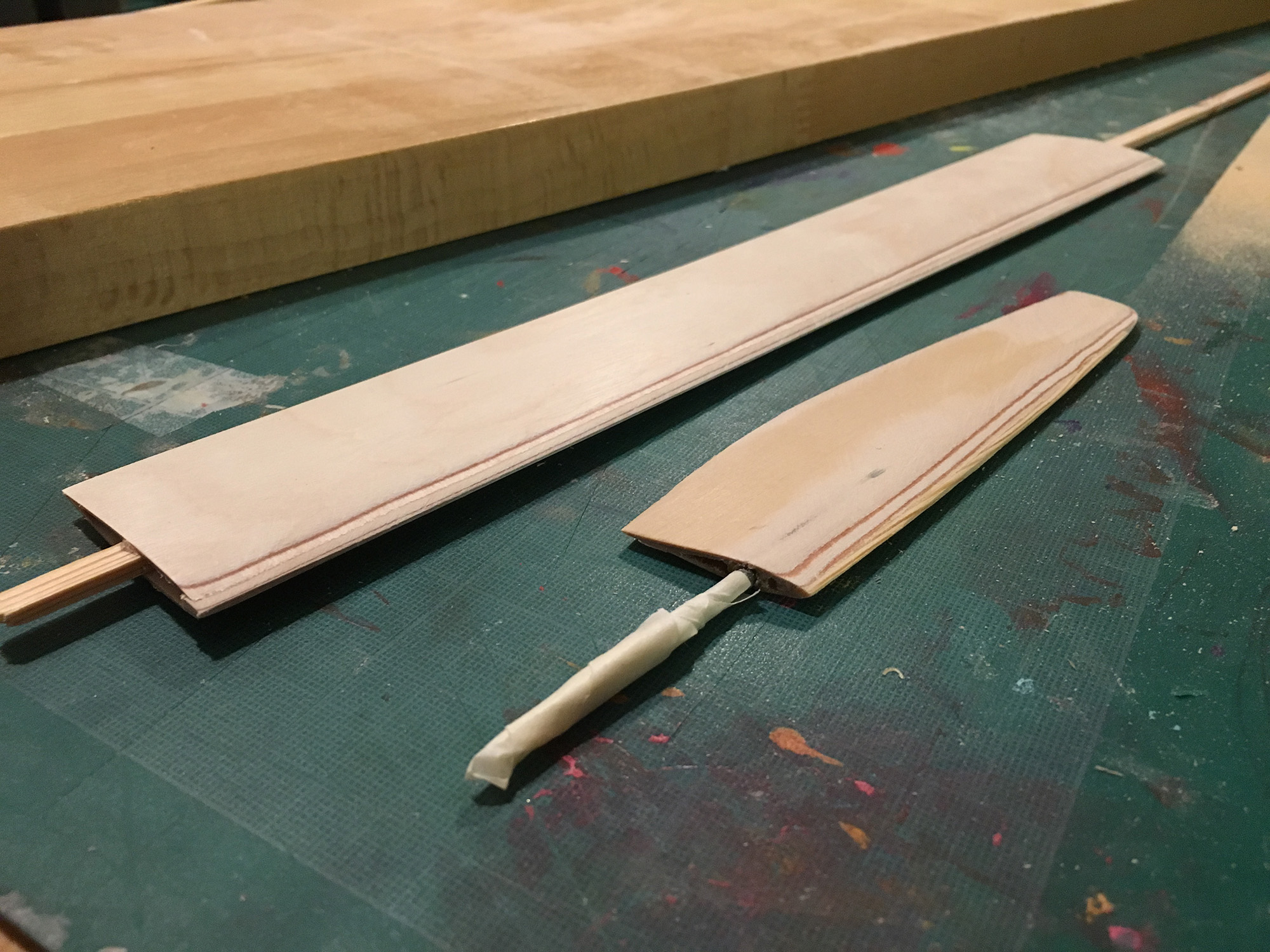- Das Schwert aus 2 Schichten (rechts/links) 1mm Sperrholz + 6x3mm Kieferleiste als Holm und einen Streifen 2mm Sperrholz als Nasenleiste.