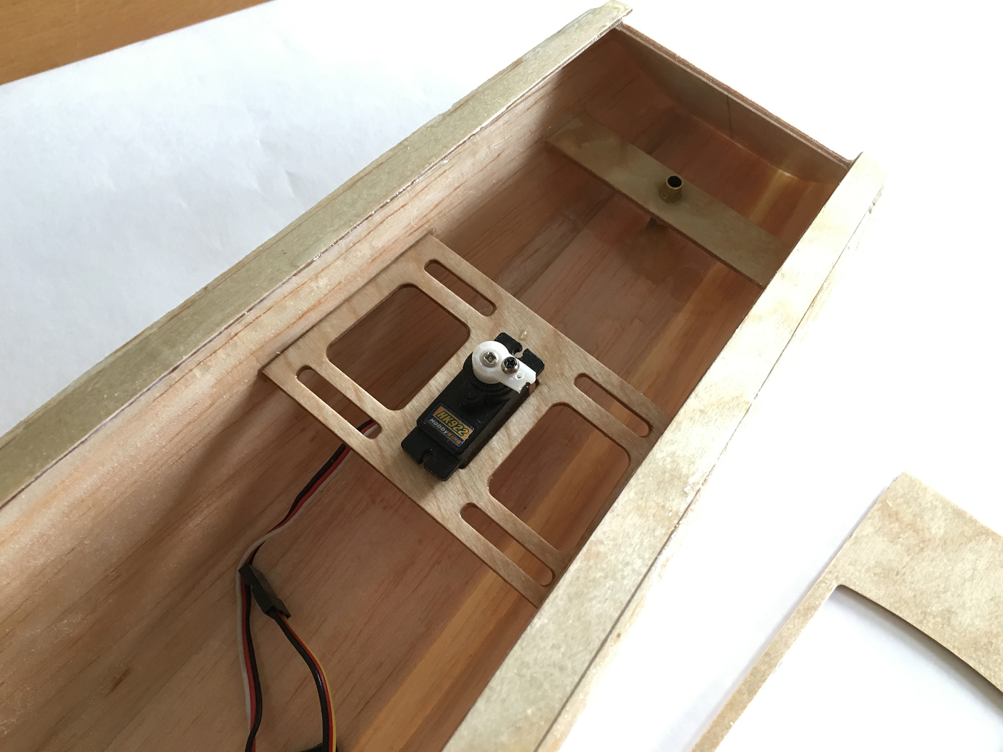 Der Mast und Kielkasten ist eingeleimt, ebenso die Servobretter.