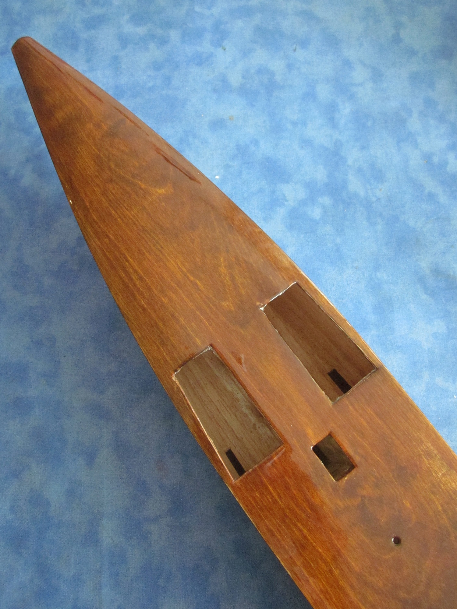 Ich würde das Holz unbedingt so belassen, die Struktur des Holzes kommt so wunderbar zur Geltung und macht doch den Charakter eines Holzbootes aus. Beim Bau meiner Goth habe ich das auch so gehandhabt. Die Schale, aus Balsaholz ist nur farblos lackiert, das Deck, aus Flugzeugsperrholz, ist gebeizt und anschliessend farblos lackiert, ist auf den beiden Fotos sehr schön erkennbar.