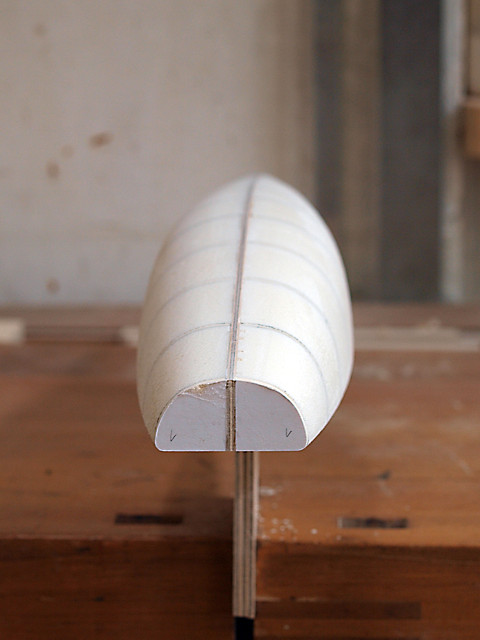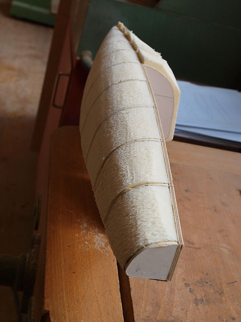 Heute habe ich noch an die zweite Rumpfhälfte Styroporklötzen angeleimt. Zuvor hatte ich die erste Rumpfhälfte grob zugeschliffen. Die vordere Hälfte auf dem Deck ist schwierig in die richtige Form zu kriegen. Der Bugbereich ist steil und gerade, gegen hinten wirds flacher und rund.
