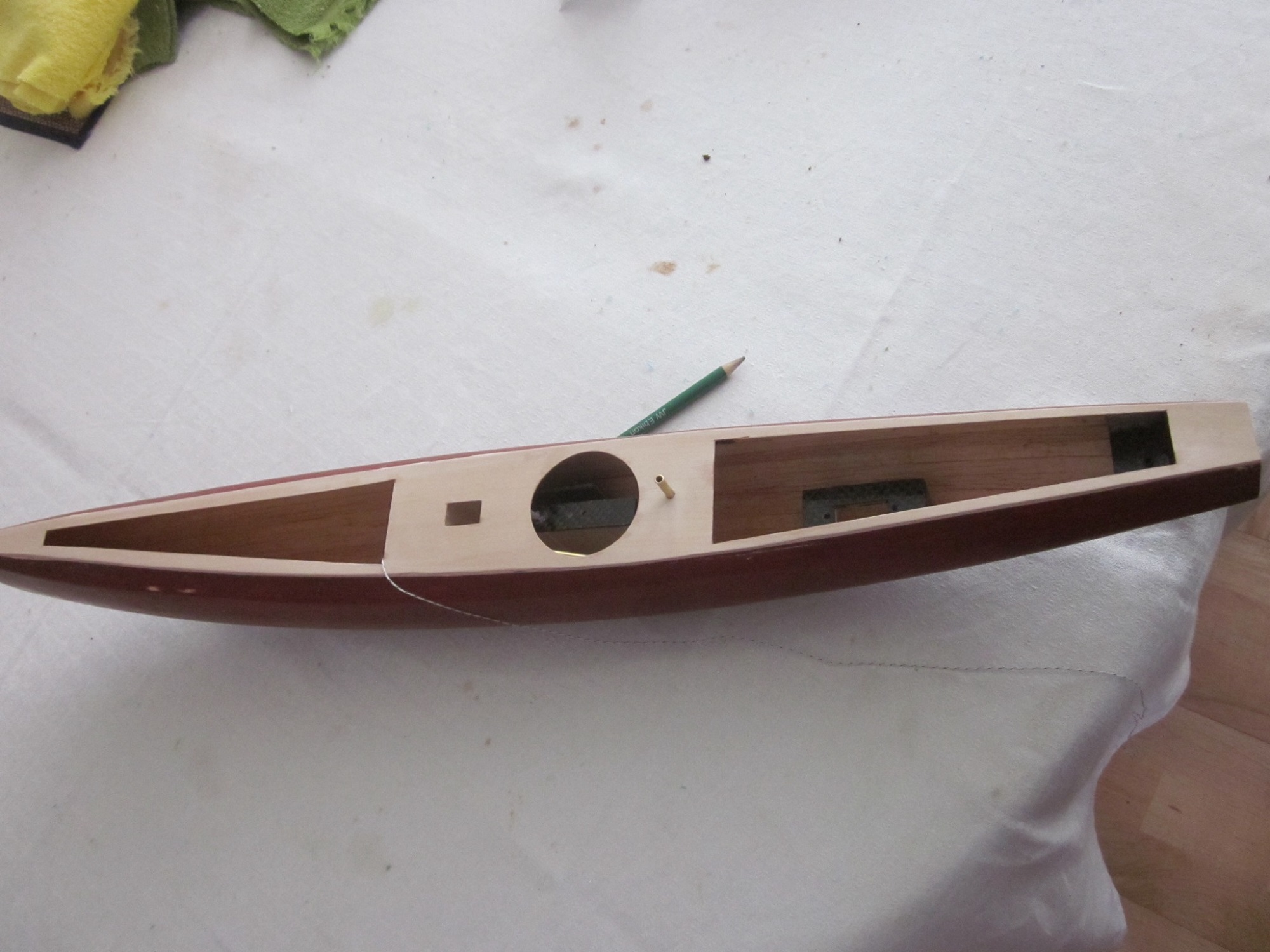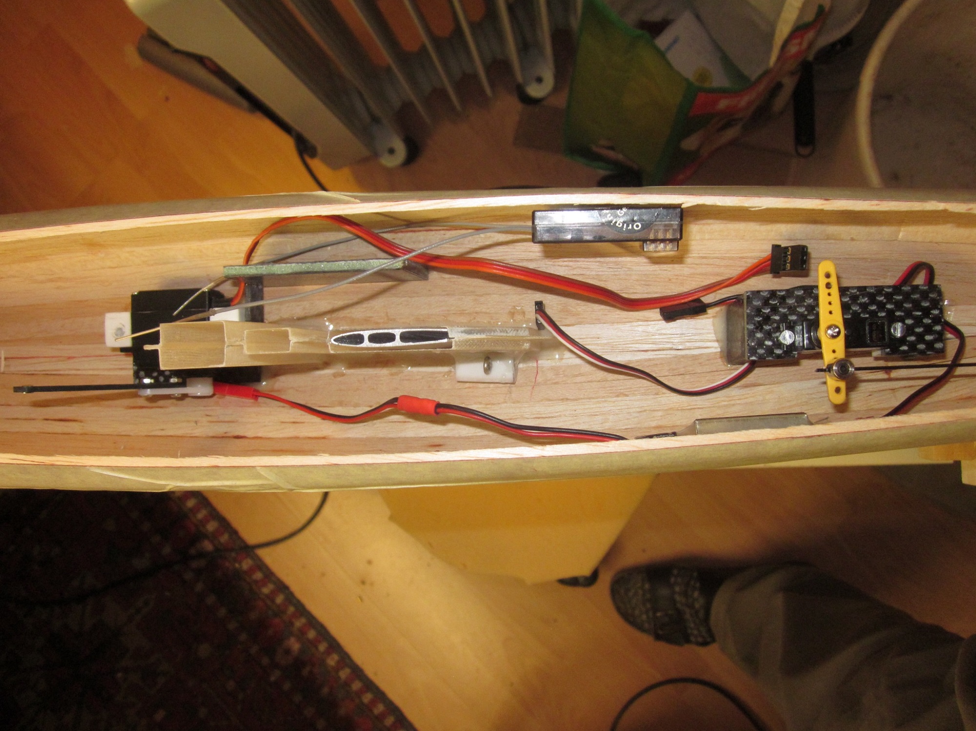 Langsam geht der Bau meiner Orion Edge dem Ende entgegen. Ich habe bei diesem Bau die Schale gebeizt, das Deck wir nur schön geschliffen und ganz am Schluss wird alles mit Klarlack behandelt, so bleibt die Holzstruktur schön erhalten. Nach dem Laminieren( 1x 49g) konnte ich den Innenausbau in Angriff nehmen. Als erstes habe ich die Mast- Kieltasche eingebaut, anschliessend der Ruderkorker und die Servohalterungen. Der Empfänger wird nur mit Klettband steuerbord seitig an der Innenwand befestigt.