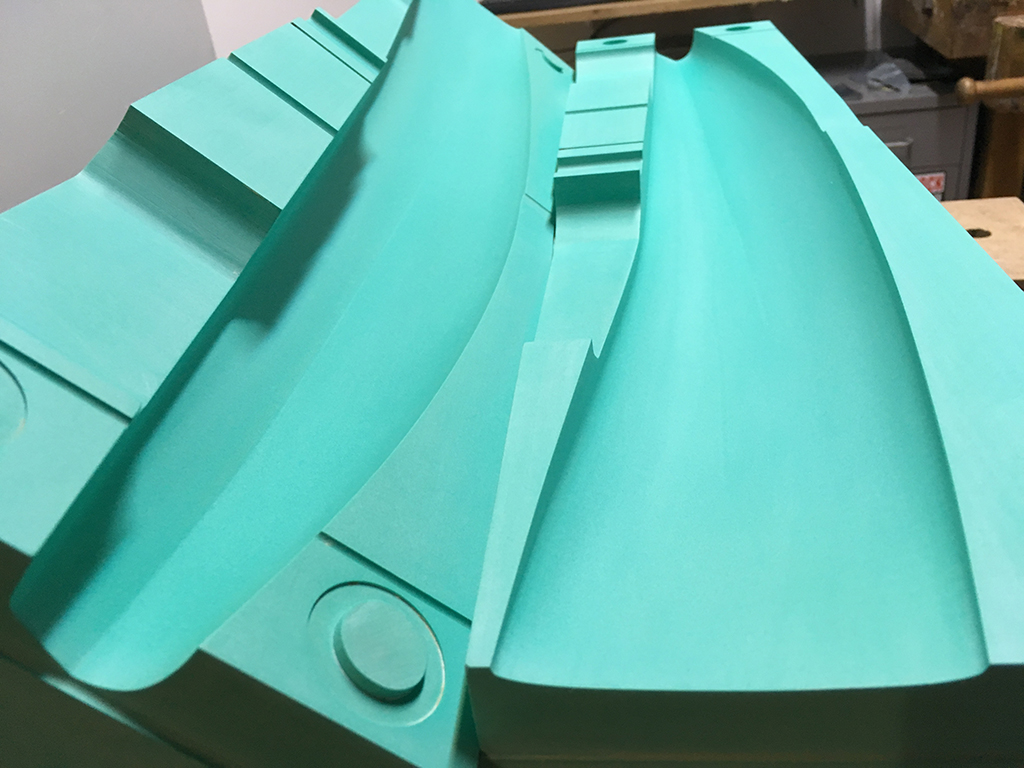 - Der Ruderkoker wird auf die Welle gefädelt, die Einheit in die erste Hälfte eingelegt. Über die Welle wird der Koker dann beim Schliessen der Form gleich richtig ausgerichtet.
