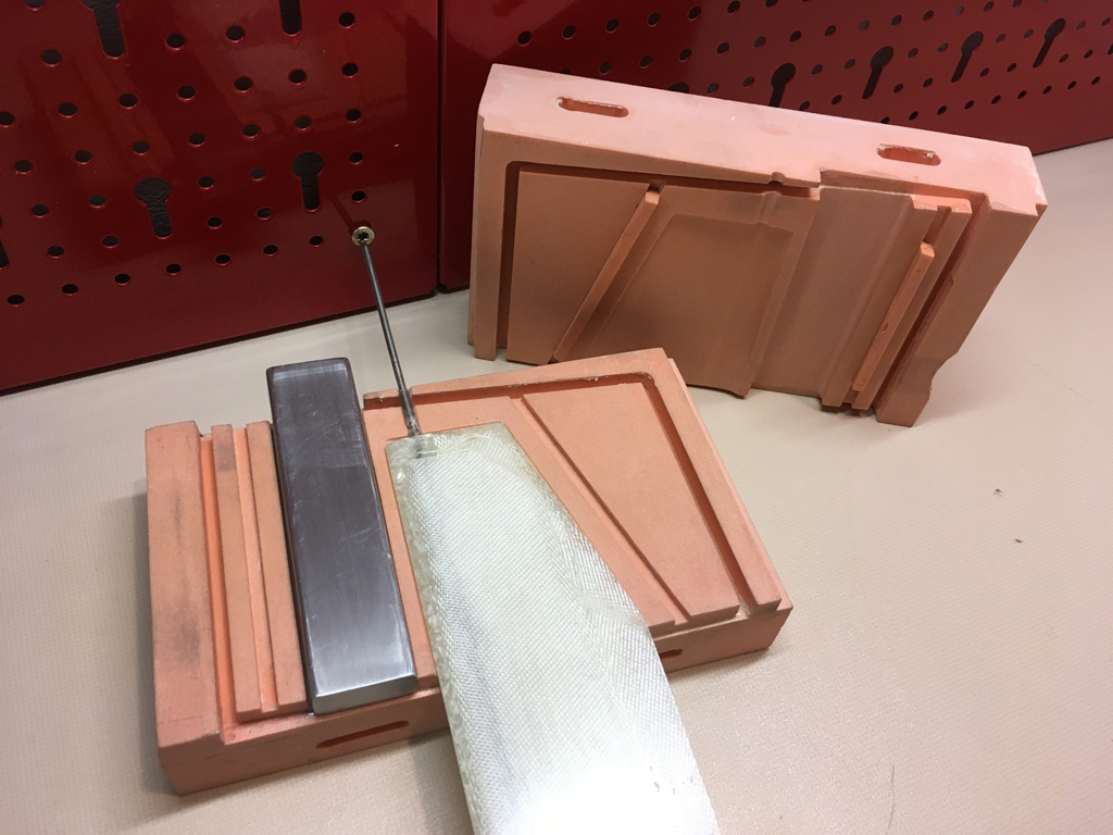-Gleiches Prinzip bei der Schwert/Masttasche. Das Schwert ist so gezeichnet das es in die Form passt. Die Tasche wird übers den Schwertdummy gestülpt. Oben wird über die Schwertverschraubung und einen Metallkern für die Masttasche fixiert, unten über die Aussparung in der Form. Als Einheit in die Form einlegen, dann Form schliessen. Durch die Löcher in der Form bleiben Ruderkoker und Schwerttasche zugänglich so das man noch eine kleine Hohlkehle kleben kann.