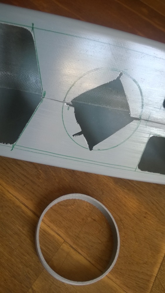 Die Position des Deckels wird angezeichnet und vier Einschnitte bis an den zukünftigen Deckelrand gemacht. Die Klebeflächen werden mit 60er Papier angeschliffen und mit Aceton gereinigt. Der Ring wird mit angedickten Harz eingestrichen und auf richtige Position gelegt. Der Rumpf wird anschließend auf dem Kopf gelegt bis der Harz durchgehärtet ist. Ich fixiere den Ring nicht da ich mehrmals die schlechte Erfahrung gemacht habe das sich dadurch Beulen auf dem Deck abzeichnen. Da der Epoxydharz aber Spaltüberbrückend ist, ist ein klammern o.ä. auch nicht erforderlich. Nach dem durchhärten des Harzes wird das überschüssige Deck entfernt, die Kante sauber verschliffen, fertig.