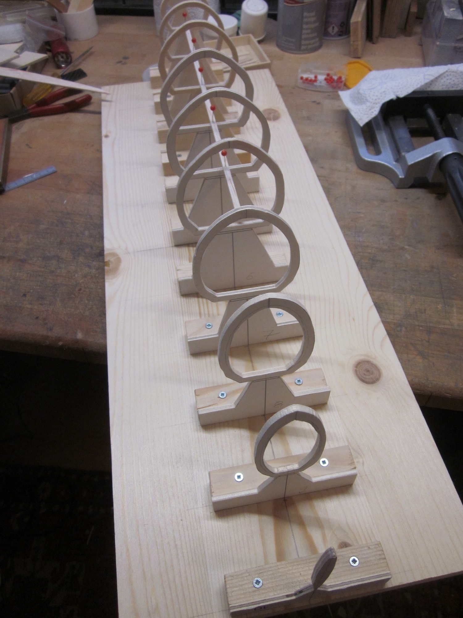 Auch hier entsteht eine Orion Edge. Die Spanten sind aus Sperrholz 4mm gefertigt und der Kern ist ausgesägt, was die Arbeit beim Beplanken und beim Ausbau derer sehr erleichtert (wurde an anderer Stelle bereits erwähnt)