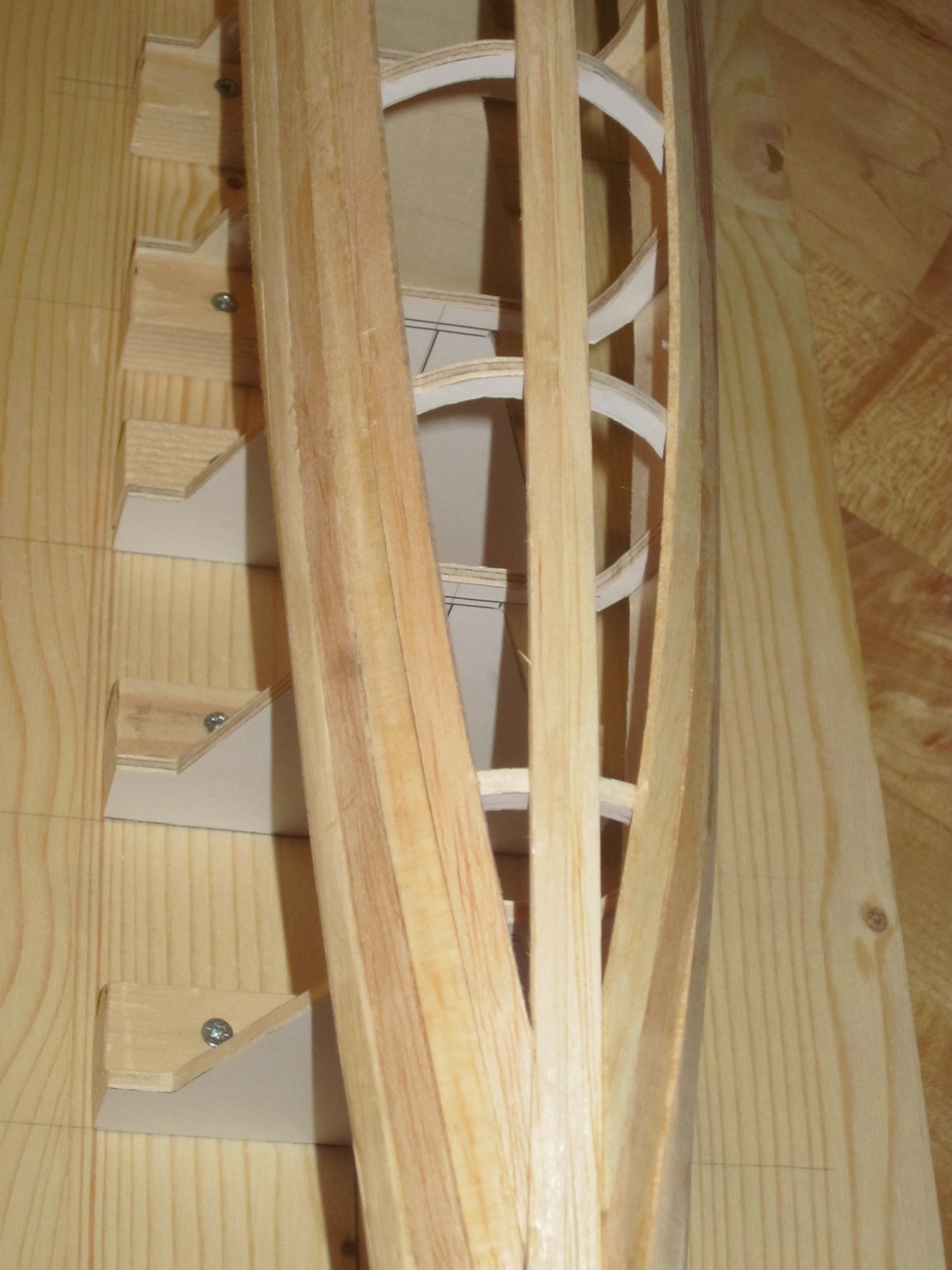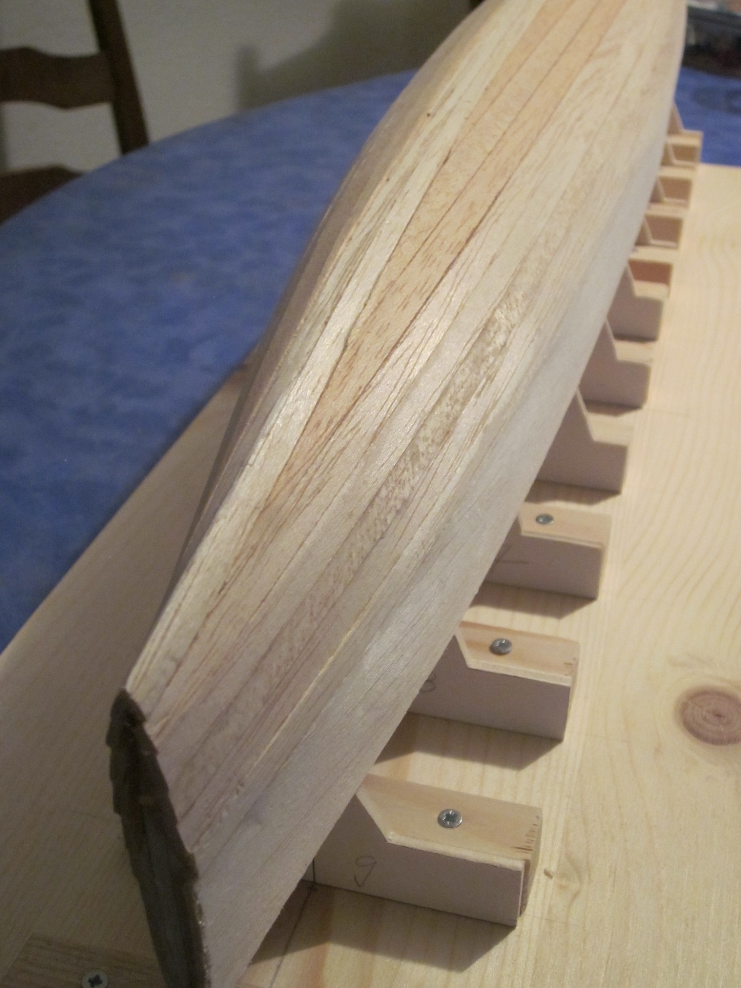 Eine besondere Herausforderung ist der Übergang von Planke 1 zu Planke 2. Zur Anbringung der Planke 1 habe ich die Schale von der Helling genommen, die Montage von Oben her ist viel einfacher.