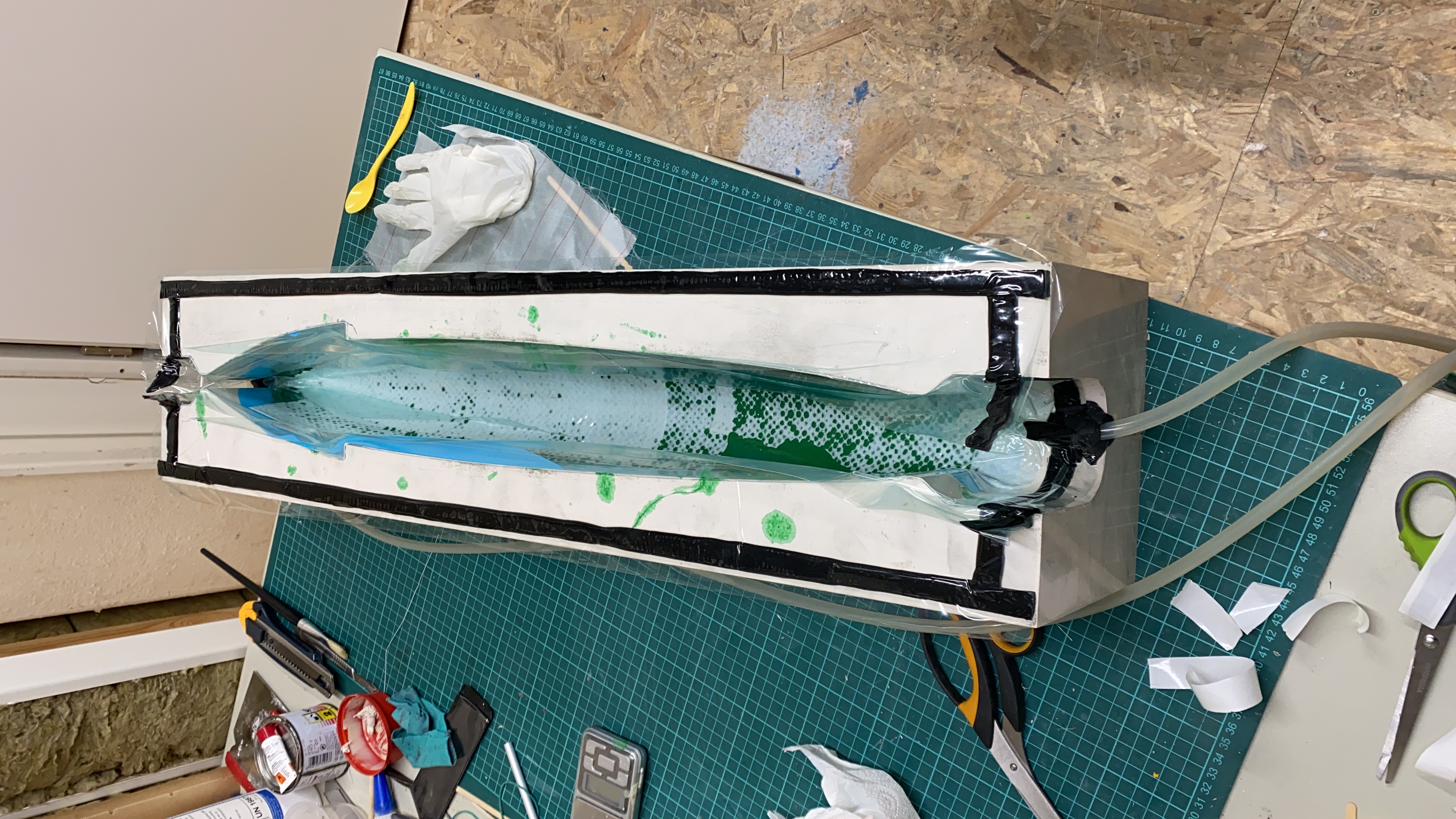 Nach erfolgter Infusion kommt die Form in eine Temperbox, welche aus Isolationsmaterial hergestellt wurde. Ein Heizlüfter sorgt für die Temperatur (ca. 40-50°C). Das wird nun über Nacht gehärtet und leicht getempert.