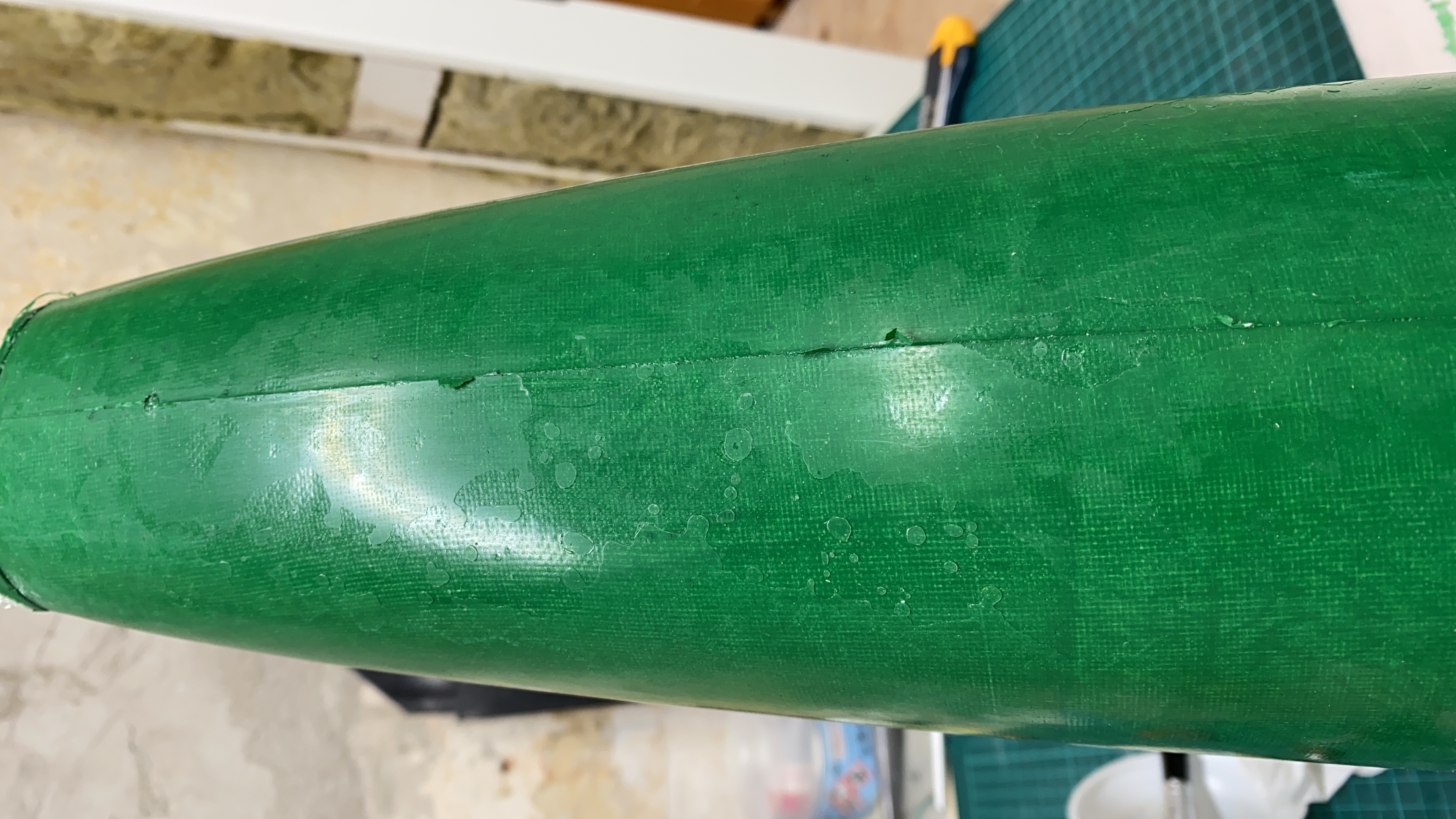 Um ihn zu retten, habe ich noch eine Lage per Hand hineinlaminiert. Dabei aber nicht aufgepasst, ob der Rumpf wieder sauber in der Form liegt :oops: und somit ist das Harz durchgelaufen durch die Pinholes... absoluter und unnötiger Anfängerfehler! :evil: