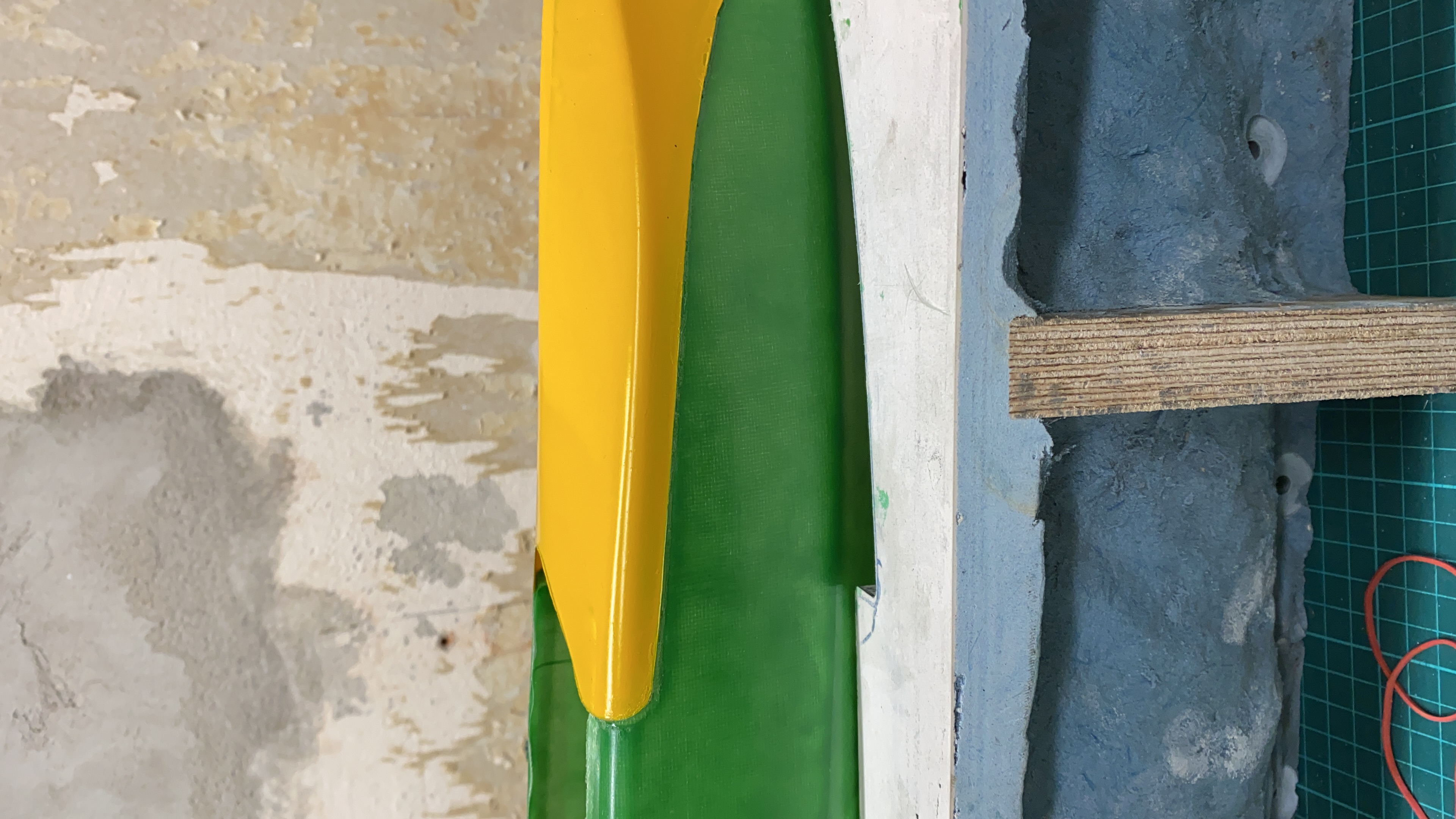 auch hier wurde vorher Farbe in die Form gesprüht und anschließend laminiert.