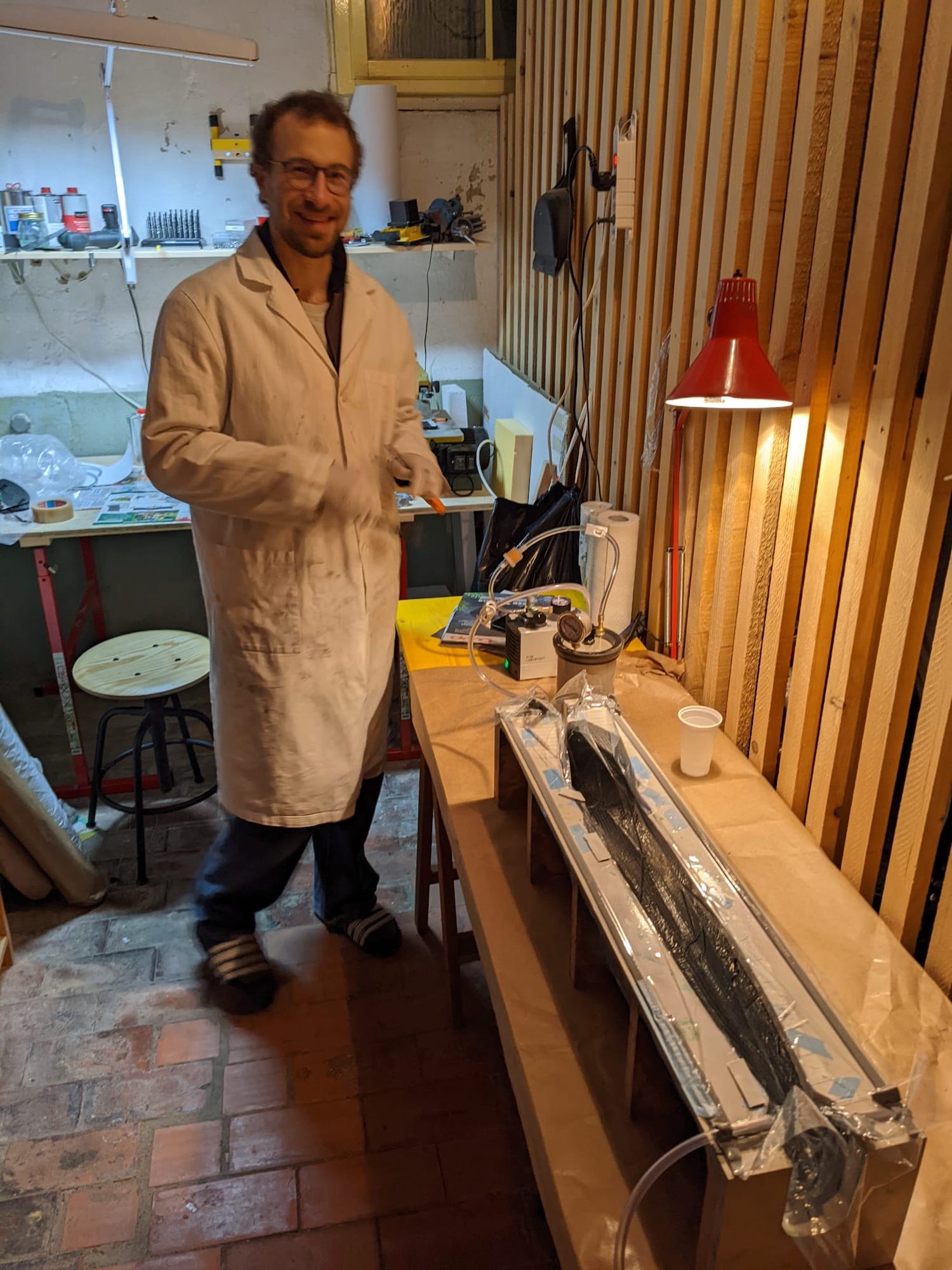 Das Vakuum haben wir auch zuerst ohne Harz angelegt um die Dichtigkeit zu prüfen für ca 1h (Mittagessen... ;-) ). Und dann wurde das Harz auch sehr langsam angesogen während ca 20-30 Minuten. Werde das nächste Mal das Vakuumm laufen lassen und bedeutend weniger Harz anrühren... Dann wirds wohl schon hinkommen mit dem Gewicht. Der Schlauch (ID 6 mm) ist ganz einfach mit dem Vakuumdichtband (mehrlagig) in die Form gebracht, ohne "Verschleissteile".