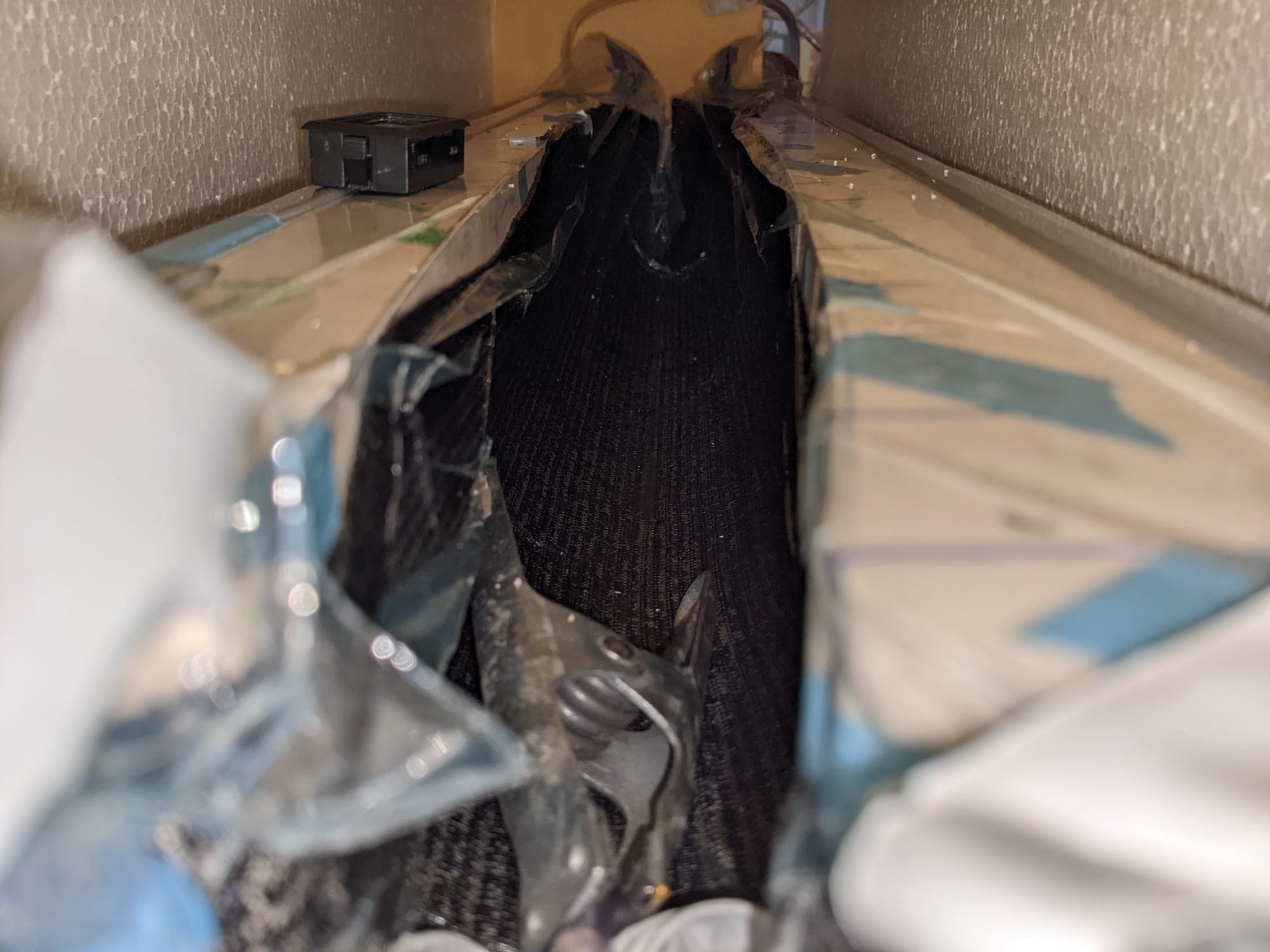 Danach kommt trocken das zugeschnittene Gewebe in die Form (1x 49g/m^2 Leinwand Glas, 2x 81 g/m^2 Köper Glas). Für die Infusion braucht man eine Lage Abreissgewebe, anschliessend ein Flowmesh (SCS Flowgrid medium). Die Geweblagen und Flowmesh werden mit Tape grob befestigt. Dann folgt eine Lage Folie befestigt an der Urform mit Vakuumdichtband. Die Folie muss dabei möglichst mit Falten angebracht werden. So ist genügend “Material” vorhanden und das Vakuum zieht die Folie dann schön an die Form.
