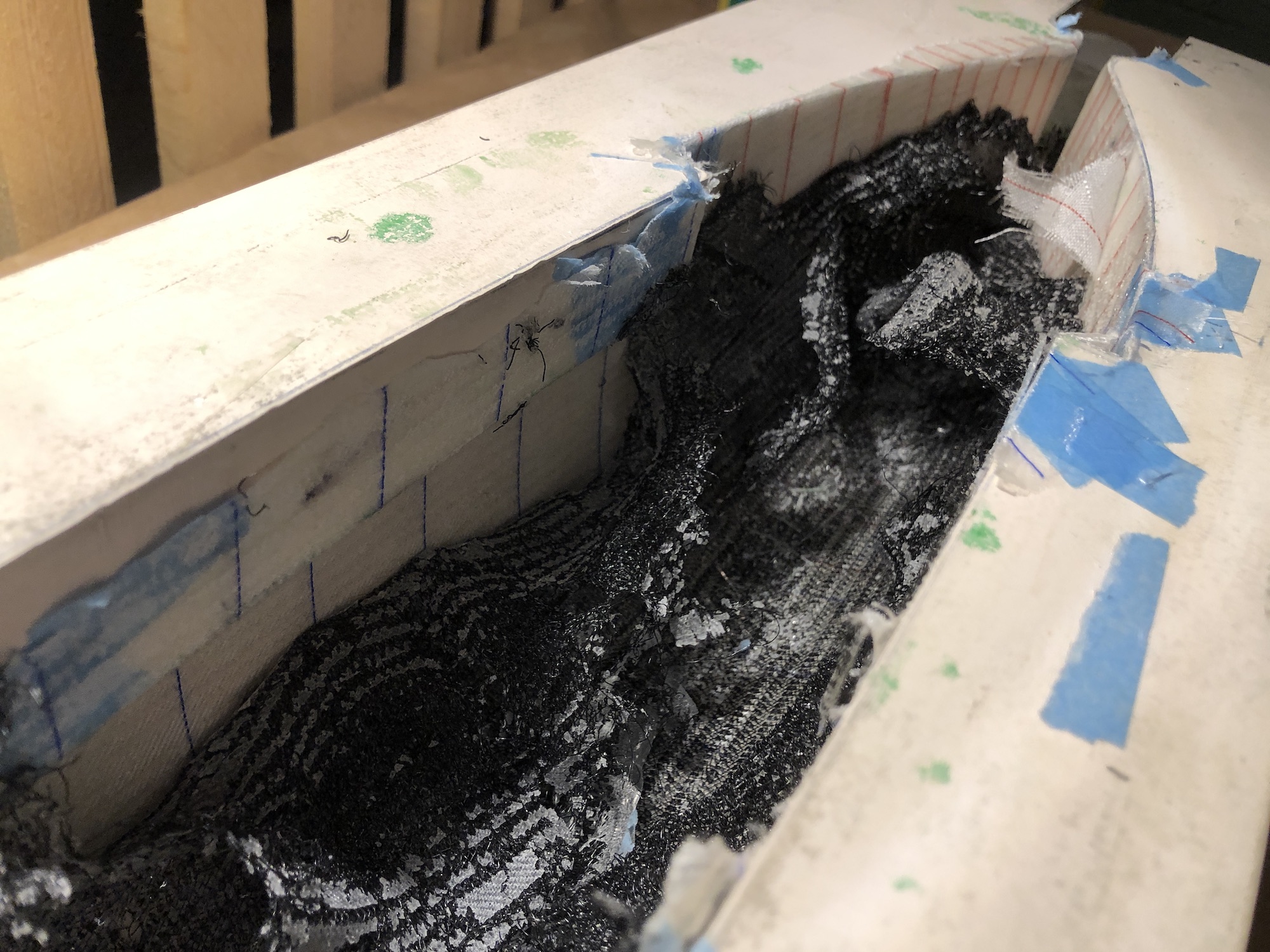 • Das Tape zum Fixieren hat Spannung aufs Gewebe gebracht und somit zu Fehlstellen. Das Gewebe ist dadurch nicht überall am Rumpf angelegen, vor allem in der Decksrundung und an der Rumpfnaht. Beim nächsten Mal werden wir keine Fixierungstapes verwenden.