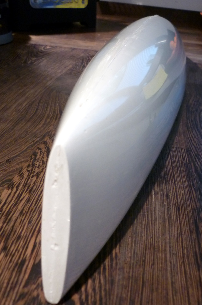 Der Rumpf auf dem Photo ist unbearbeitet so wie er aus der Form gekommen ist. Die Nase ist auch gleich fertig mit dran, da braucht man keine Airexflicken mehr einzukleben. Das ganze wiegt so wie er ist 100g. Wenn das Deck ausgeschnitten ist gehen da nochmal 15-20g von ab. Kein leichtgewicht aber durchaus zu verwenden, die Festigkeit beim Anfassen ist jetzt schon mehr als ausreichend und da passiert in den nächten Tagen ja noch was.