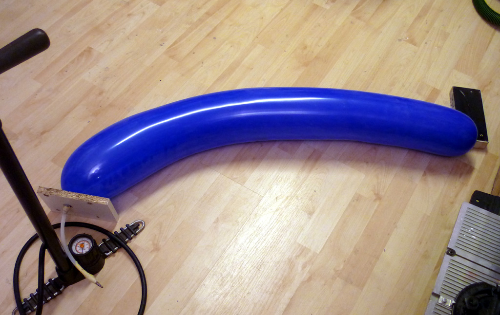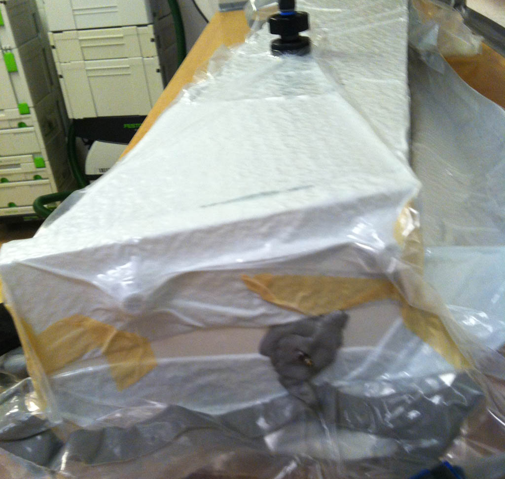 das ist Ausblastechnik "light". Leider etwas unscharf aber wer genau hinsieht erkennt das Fahrradventil in der Abschlußplatte. Da ist ein Ballon dran, das Ventil ist nach Aussen offen, der Rest abgedichtet. Das ganze ist im Vacuumsack. Der Unterdruck zieht dann den Ballon auf. So hat man den Vorteil das die Form ohne Verschraubung gut vom Vacuum zusammengepresst wird und von innen der Ballon alles andrückt und Harz rauspresst. Ausserdem ist das ganze so natürlich schonender für die Form.