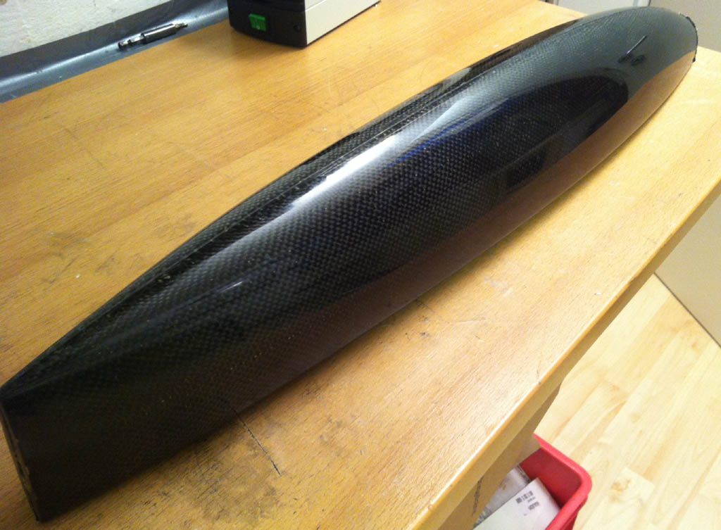 Sieht schon deutlich besser aus, keine Luftblasen, die hellen Stellen sind die wo das Kevlar durchschimmert. Funktionell wie schon geahnt ist der Rumpf super. Optisch viele Fehler wo das Gewebe verrutscht ist oder eben nicht deckt. Nächster Versuch vorher zwischen Blumenfolie walzen...