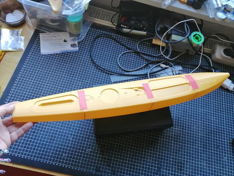 Ich konnt's einfach nicht lassen! Gestern mal den Rumpf der EVO mit irgendeinem PLA gedruckt. So als Probestück, um mal so ein Gefühl für das Teil zu bekommen und vor allem, um die Kleberei ein wenig zu erproben.