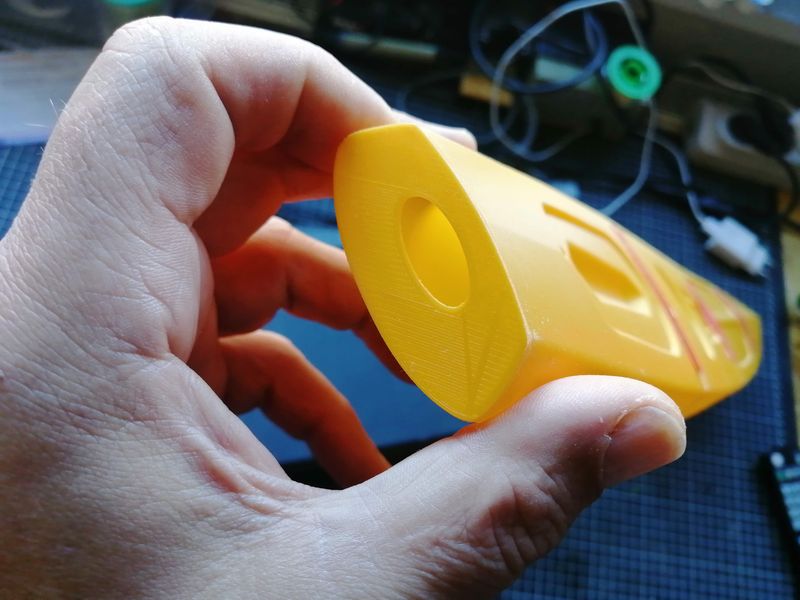 96 g, kein Verzug oder irgendwelche Beulen. Auch die Layerhaftung scheint trotz Drücken und Quetschen gut. Jedenfalls ging nichts kaputt. Sieht insgesamt also schon einigermaßen brauchbar aus.