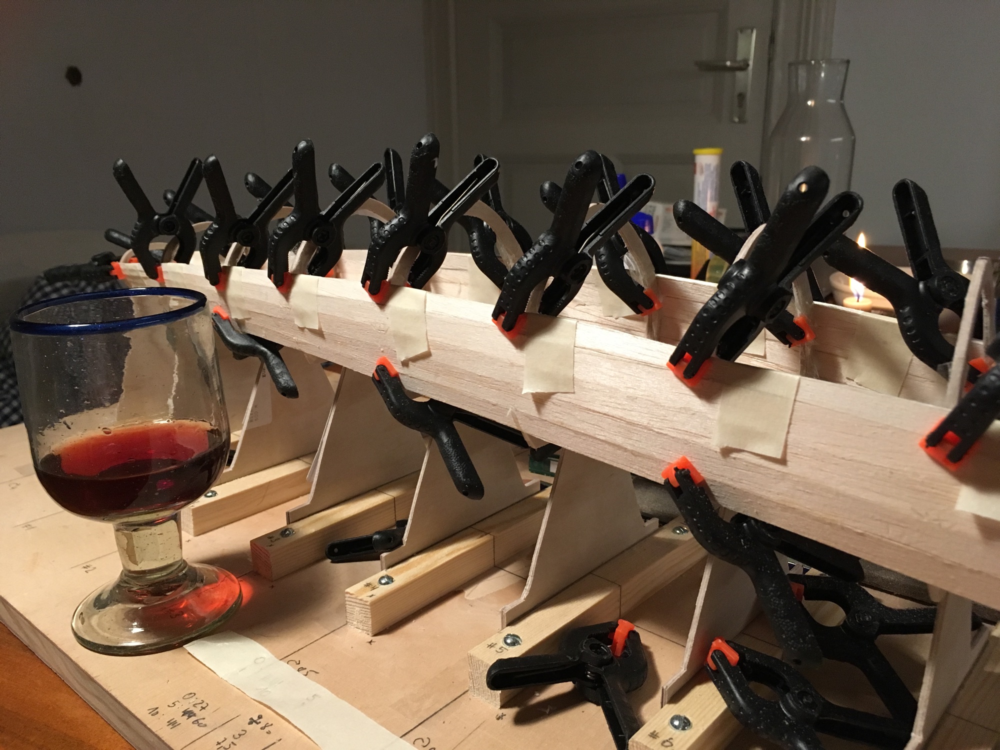 Vor dem Leimen schneide ich mir 12 Stücke Tesa Krepp zurecht - dann wird Spantfeld für Spantfeld erst mit Krepp die Planke am Vorgänger fixiert und dann sofort mit der Klammer am Spant befestigt. Das ergibt eine schöne Kontur.