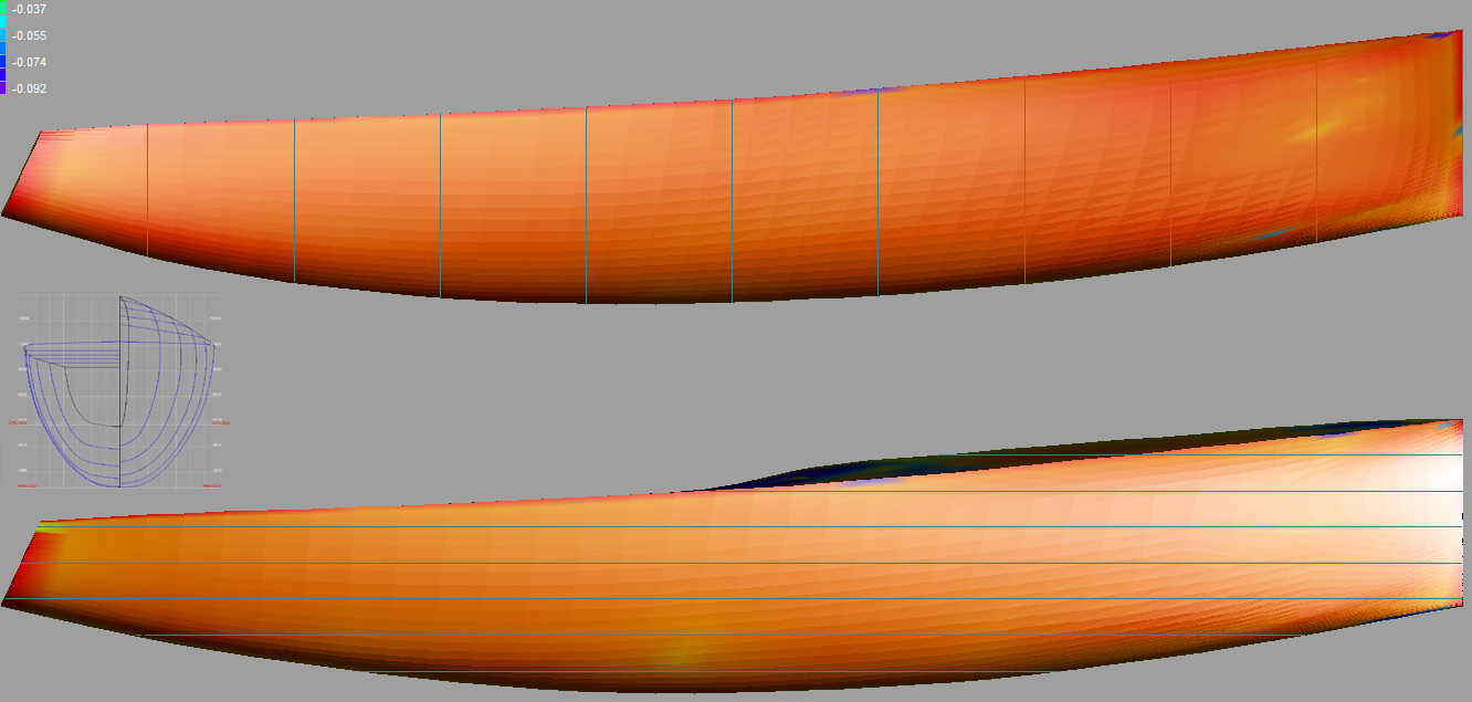 oben MaLi 1.0, unten MaLi 2.0 mit Spantenriss (Rockerlinie etwas entschärft und dafür etwas weniger Rundspant, im Grunde einfach das Unterwasserschiff hinten in der Mitte etwas nach oben eingedellt).