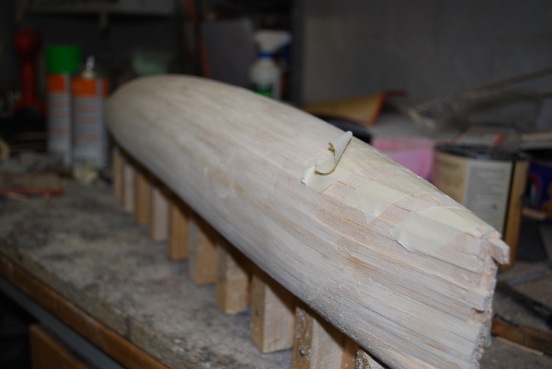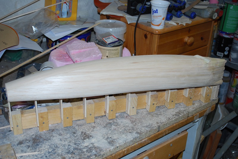 Die Spanten aus 4mm Pappelsperrholz stehen. Ebenfalls sind die ersten 3 Planken drauf.