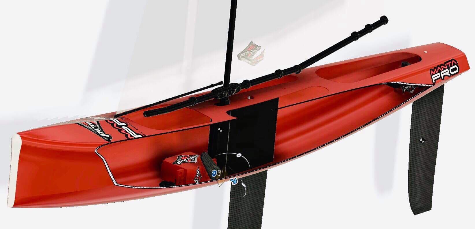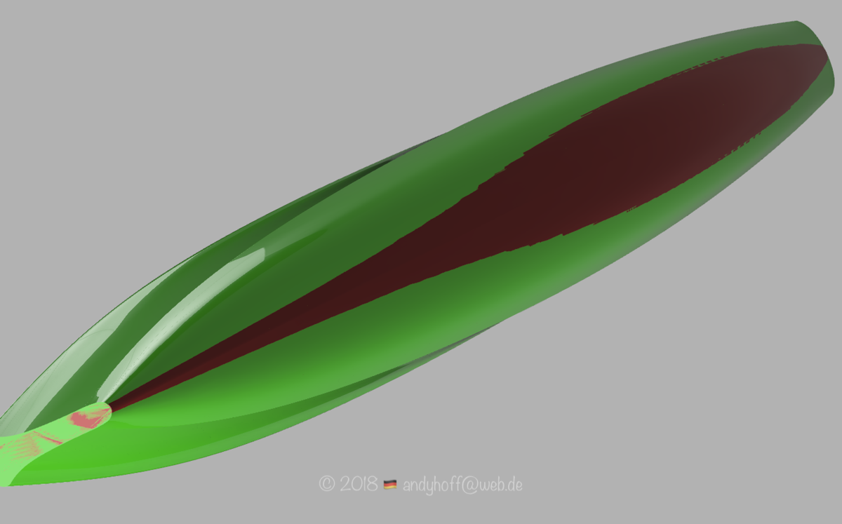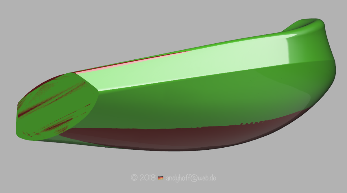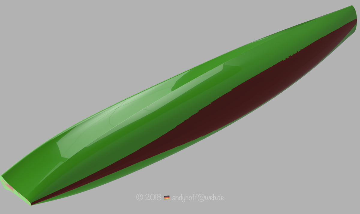 Man kann also erkennen das die mPRO weniger Tiefgang, dafür aber etwas breiter ist und mehr U-Spant hat. Vor allem oben im Vorschiff hat die mPRO mehr V und hat eine ausgeprägte konkave Wölbung. Und die Chine ist nicht mehr scharfkantig sondern abgerundet. Ein kleiner Gag ist die Wulst vorne an der Deckkante die bis zum Bugfender immer deutlicher wird. Samuel wollte etwas besonderes .. ein wiedererkennbares Merkmal am Boot haben. Das habe ich in Fusion mit den Freiformflächen irgendwie hinmodelliert .. ich glaube das bringe ich so nie wieder hin ;)