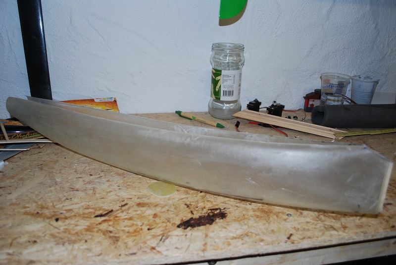 Ersten Schwimmtest bestanden. Hatte vom SUP Bau noch Deckharz über und dieses zum ersten mal für die RG verwendet. Siehe da, der erste Rumpf der sofort dicht ist.