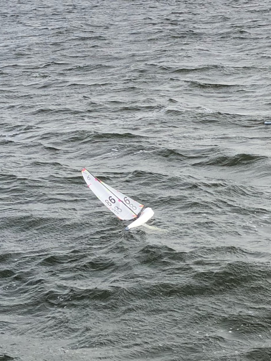 Die Wanderregatta verlief leider nicht so gut. Die erste Teilstrecke gegen den Wind war noch OK. Wenn ich etwas aufmerksamer gesegelt wäre, hätte man noch etwas Zeit sparen können. Die Hälfte der zweiten Teilstrecke Downwind war auch noch OK bis die Orka 4 dann an der Brücke die zu durchsegeln ist in einem Windloch stehen blieb und breiseitig von Bug eines 5kg + Mitbewerber getroffen wurde. Das hält natürliche keine 3D gedruckte RG aus. Glaube auch nicht das eine laminierte aus GFK oder CFK Rumpfvariante das besser weggesteckt hätte. Habe dann noch versucht (fehlerhafterweise) weiter zu segeln bis dann die Technik versagte und der Bug sich dann hob. Die noch vorhandene Luftblase konnte zum Glück nicht entweichen, so dass die Bergung durch das Begleitboot noch rechtzeitig erfolgen konnte.