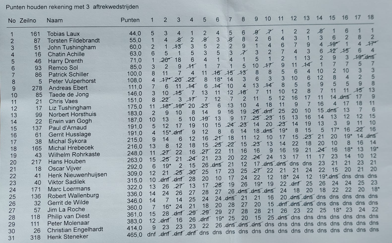 Nach weiteren 8 gewerteten Wettfahrten in A und B-Fleet stand dann am Nachmittag der Sieger der Veranstaltung fest. Ich konnte mich tatsächlich noch um einen Platz verbessern und ein kleines Punktepolster nach hinten aufbauen. Auch der relative Abstand nach vorne konnte etwas reduziert werden.