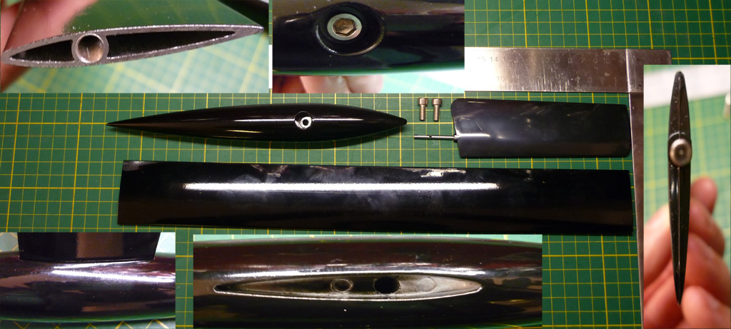 Das Schwert ist ein Aluteil ähnlich unseren Rotorblättern, oben und unten ist ein Gewinde zur Befestigung eingeschnitten, das ganze ist recht ansehnlich schwarz lackiert.