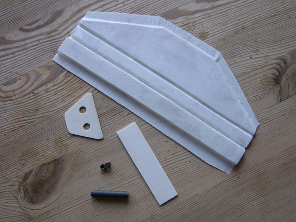 Auf dem Foto ist die noch nicht zusammengeklebte Kiel-/Masttasche zu sehen (für Swingrigg und konventionelles Rigg), der Ruderkoker mit Gleitlager, Abstützung für den Ruderkoker (das Ding mit den Löchern) und ein Sandwichelement zur Verstärkung des Decks (wenn man denn noch von Deck sprechen kann ...)