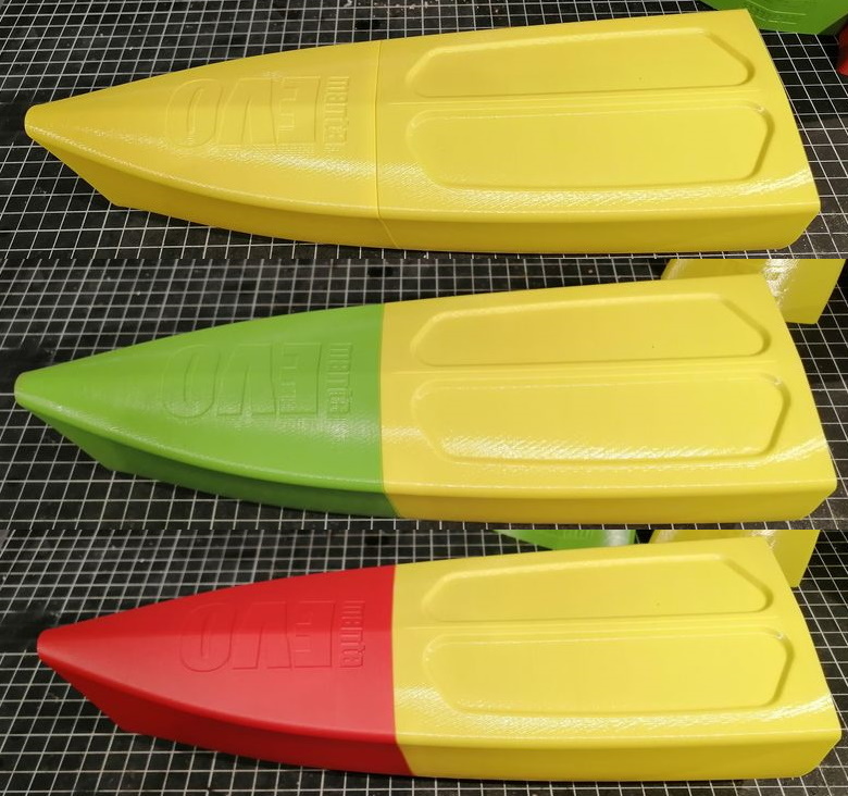Die fertig ausgedruckten Teile der EVO mit den Optionen für den Bug